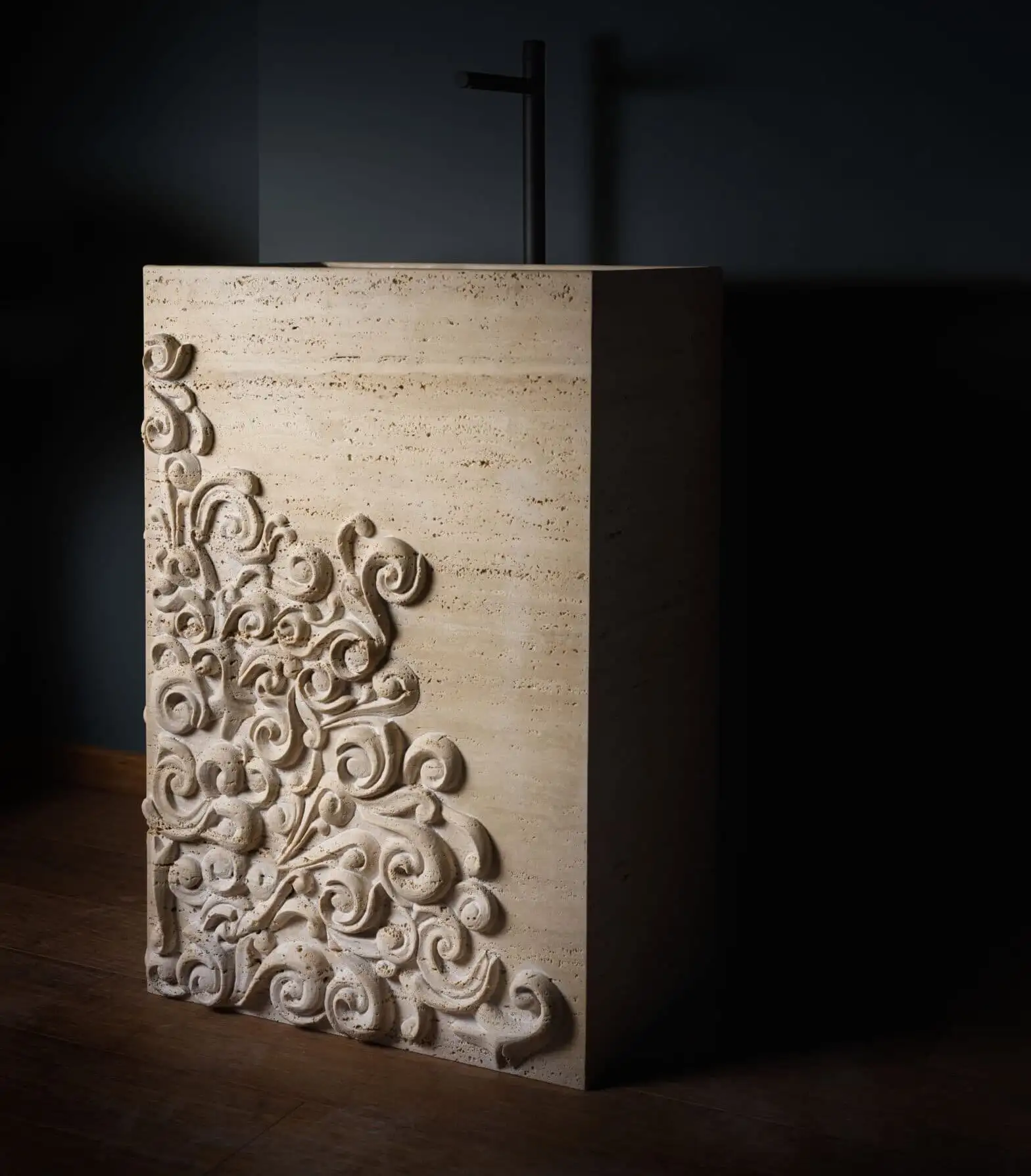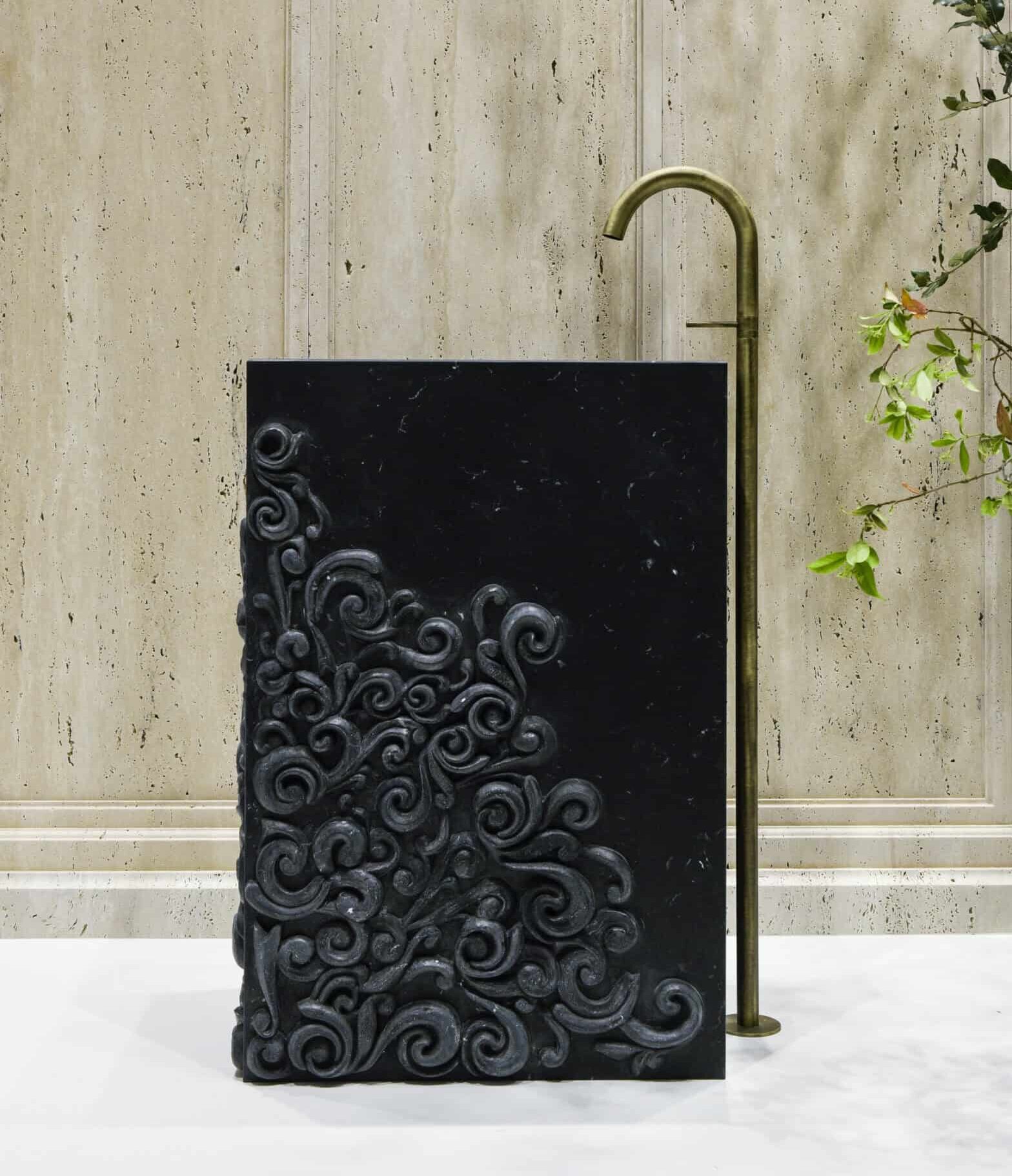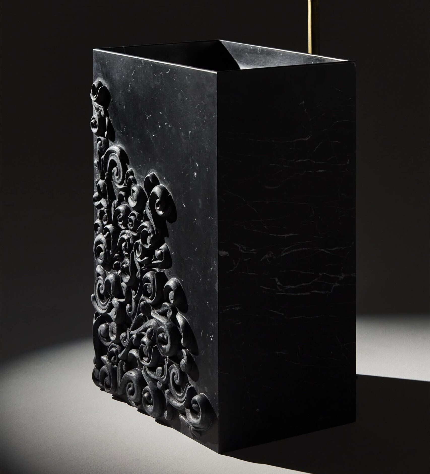 Dame is the celebration of different aesthetics coming to life as works of art for the bathroom. A design that is born from the dichotomy between classic and contemporary, minimal and decorative. With this collection, the French designer Christophe Pillet solves the relationship between “old” and “new” and creates a collection of marble sinks and free-standings that are partially smooth and honed, and partially hand sculpted. The exterior has been treated like a precious sculpture, with circular counter sinks and geometric free-standings. The interior of the product can be in contrast and customized with a choice of 5 different types of marble, in order to achieve the elegance of twotoned natural materials. The sets of stone meet around the border that have been skillfully cut to an extremely thin thickness. The Dame family is ideal for residential and high end hospitality projects.