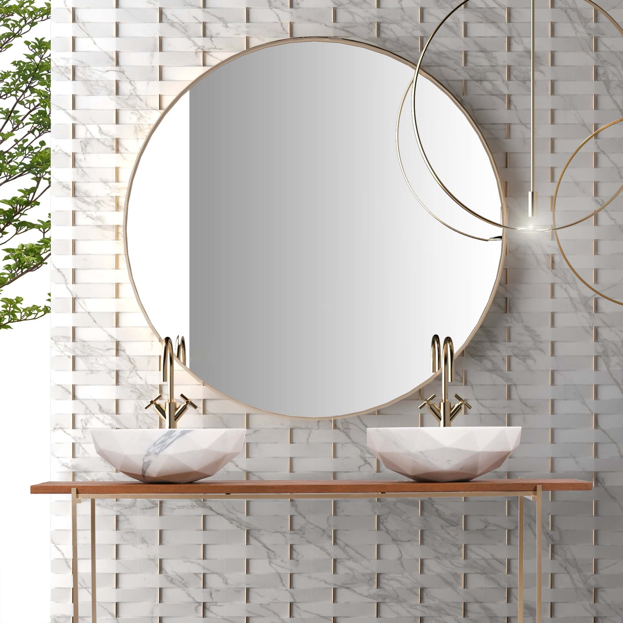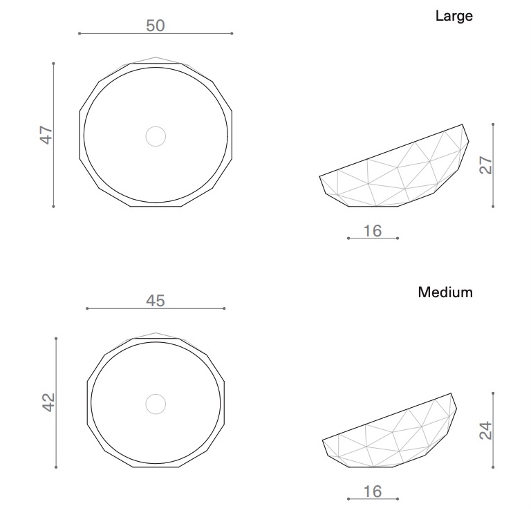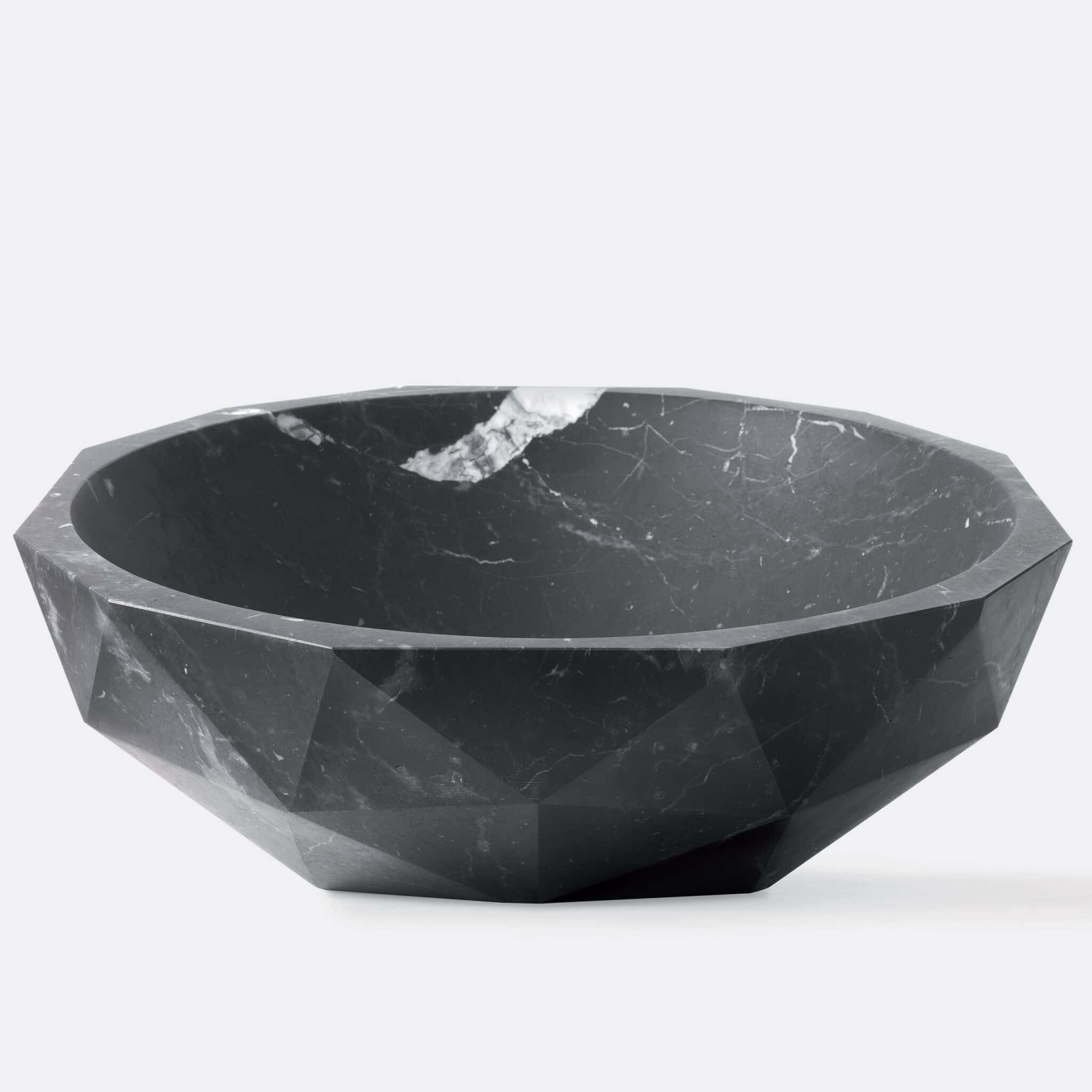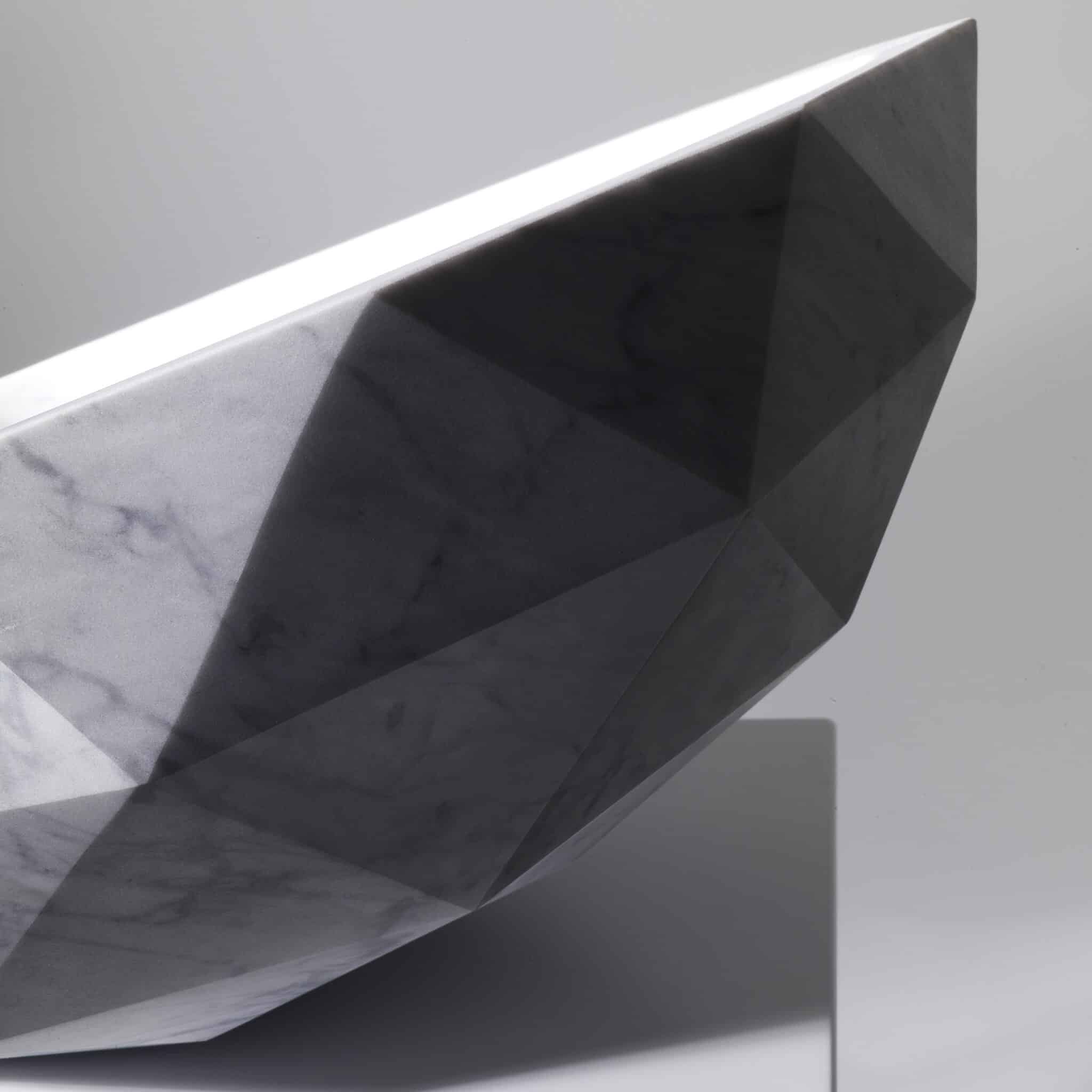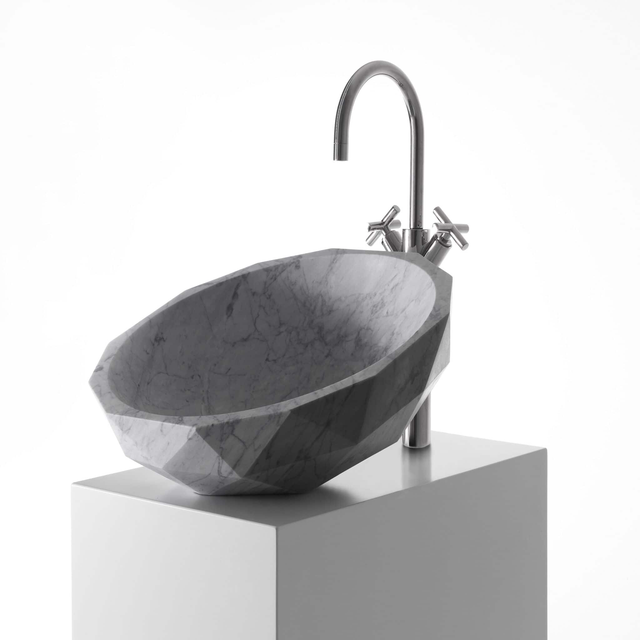 The relationship of formal antithesis between inside and outside determines the design of Diamond, a collection of countertop washbasins in two sizes and an equal number of setting possibilities designed by Paolo Ulian. The internal bowl, which can also be inclined in relation to the top, has a perfectly smooth finish and its seamless circular profile contrasts with the faceted finish of the outer shell, which also characterizes the edge. The game of triangular cuts exalts the marble – proposed in eight different types – and its natural shades, offering at the same time an elegant decorative pattern, yet essential and contemporary.