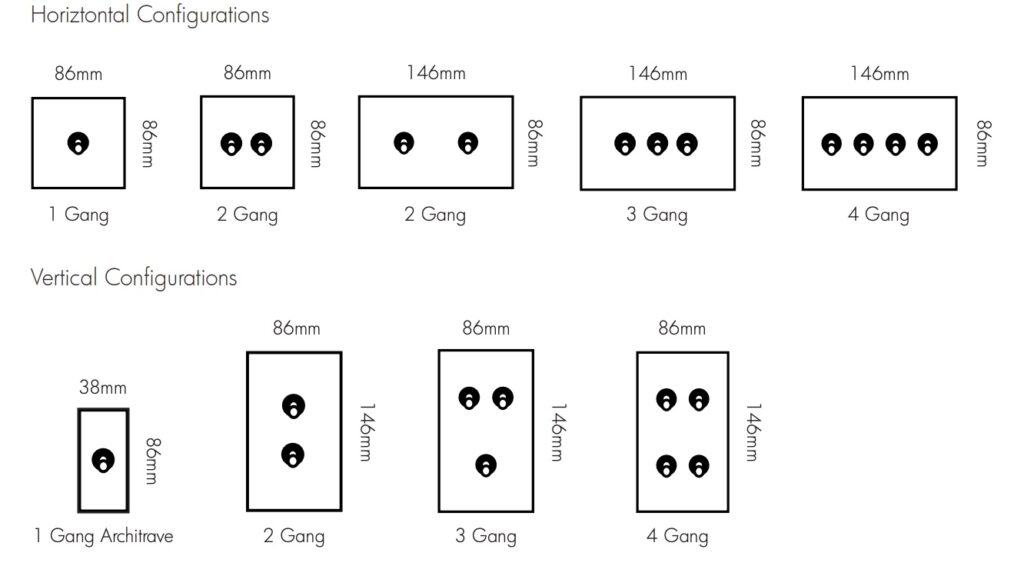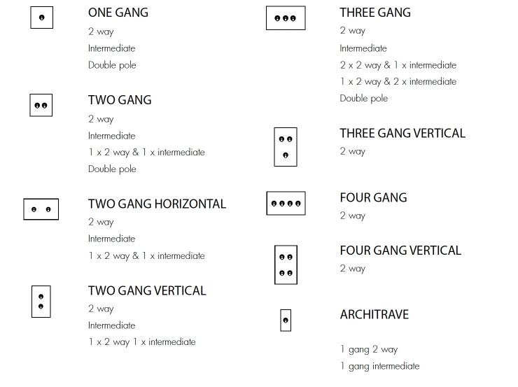 Specification: FOUR Gang, FOUR Gang VERTICAL, ONE Gang, THREE Gang, THREE Gang VERTICAL, TWO Gang, TWO Gang HORIZONTAL, TWO Gang VERTICAL
