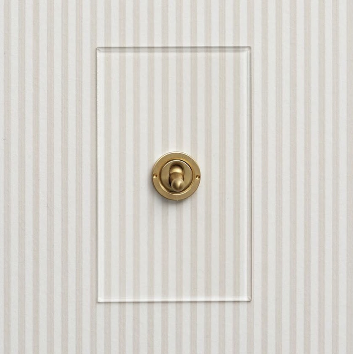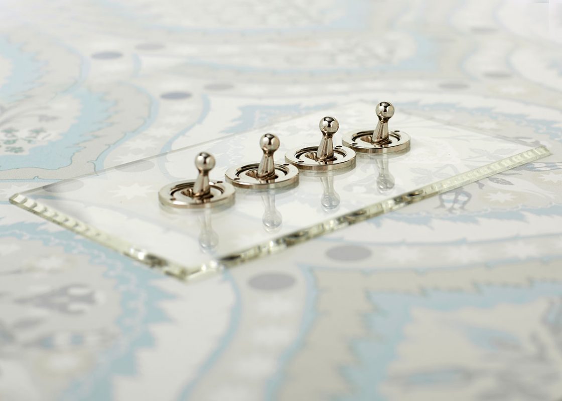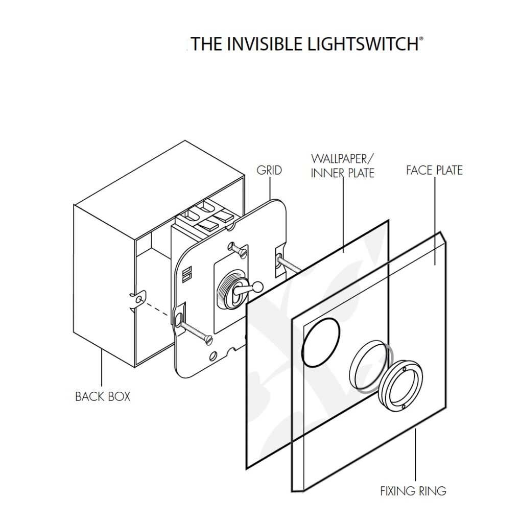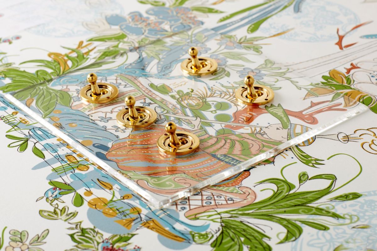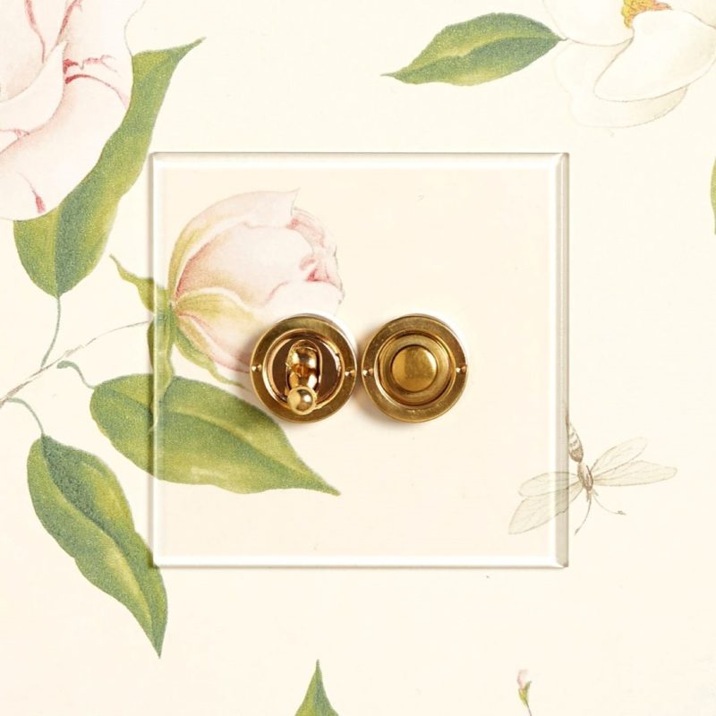 The transparent acrylic plates are secured without the use of fixing screws. The plate sits flush to the wall and is supplied with Brass, Brushed Brass, Nickel Silver, Stainless Steel or Antique Bronze switches or dimmers. Each acrylic plate comes with a primed aluminium underplate which can be either painted or used as a template where wallpaper is used.