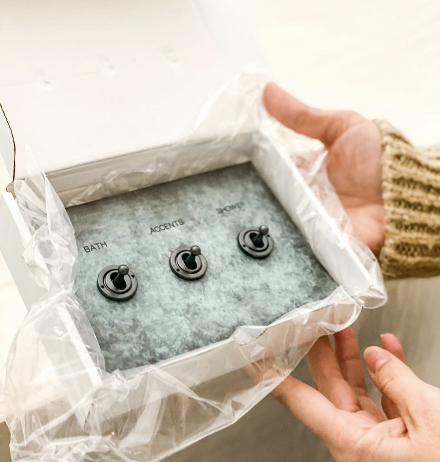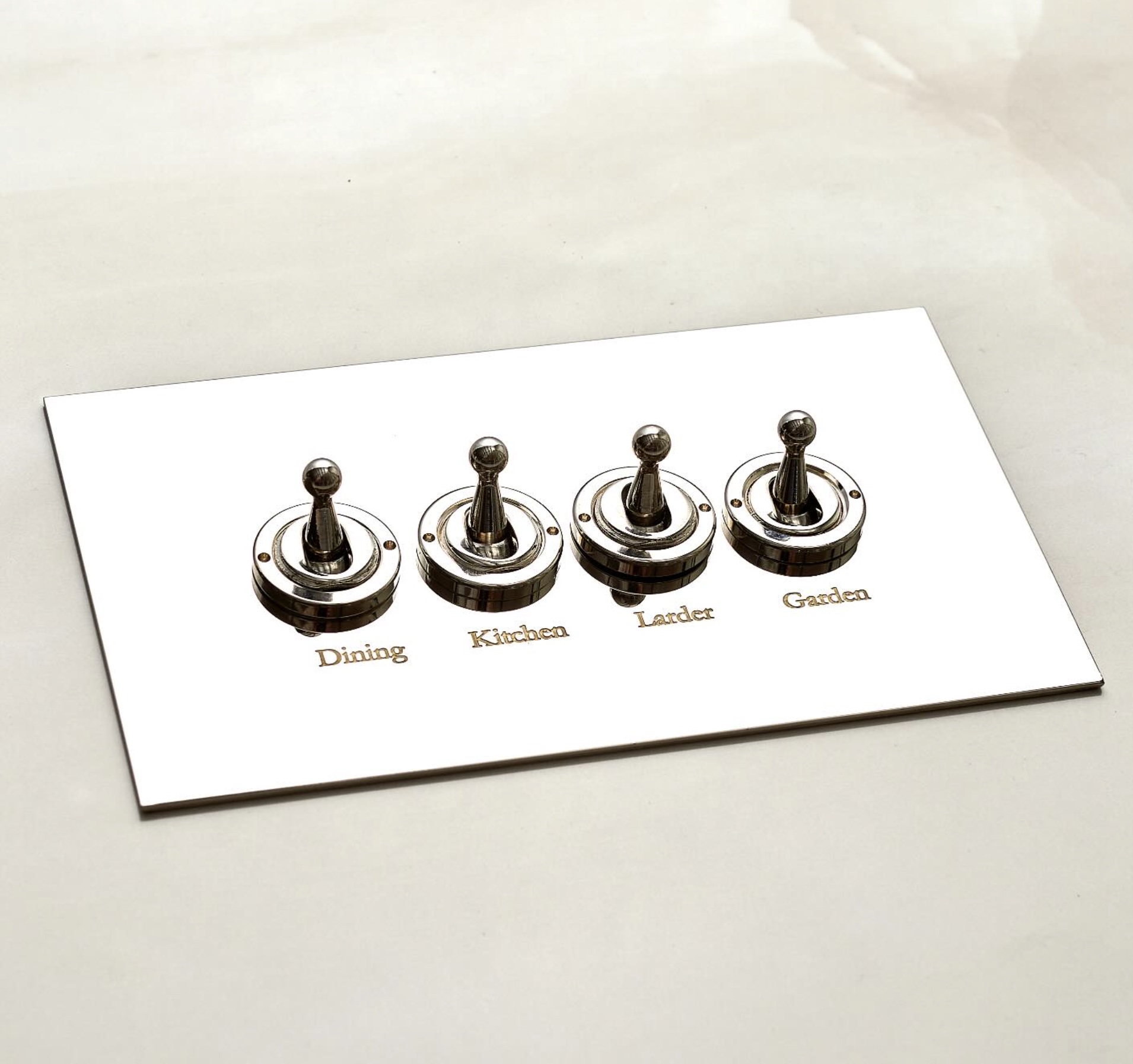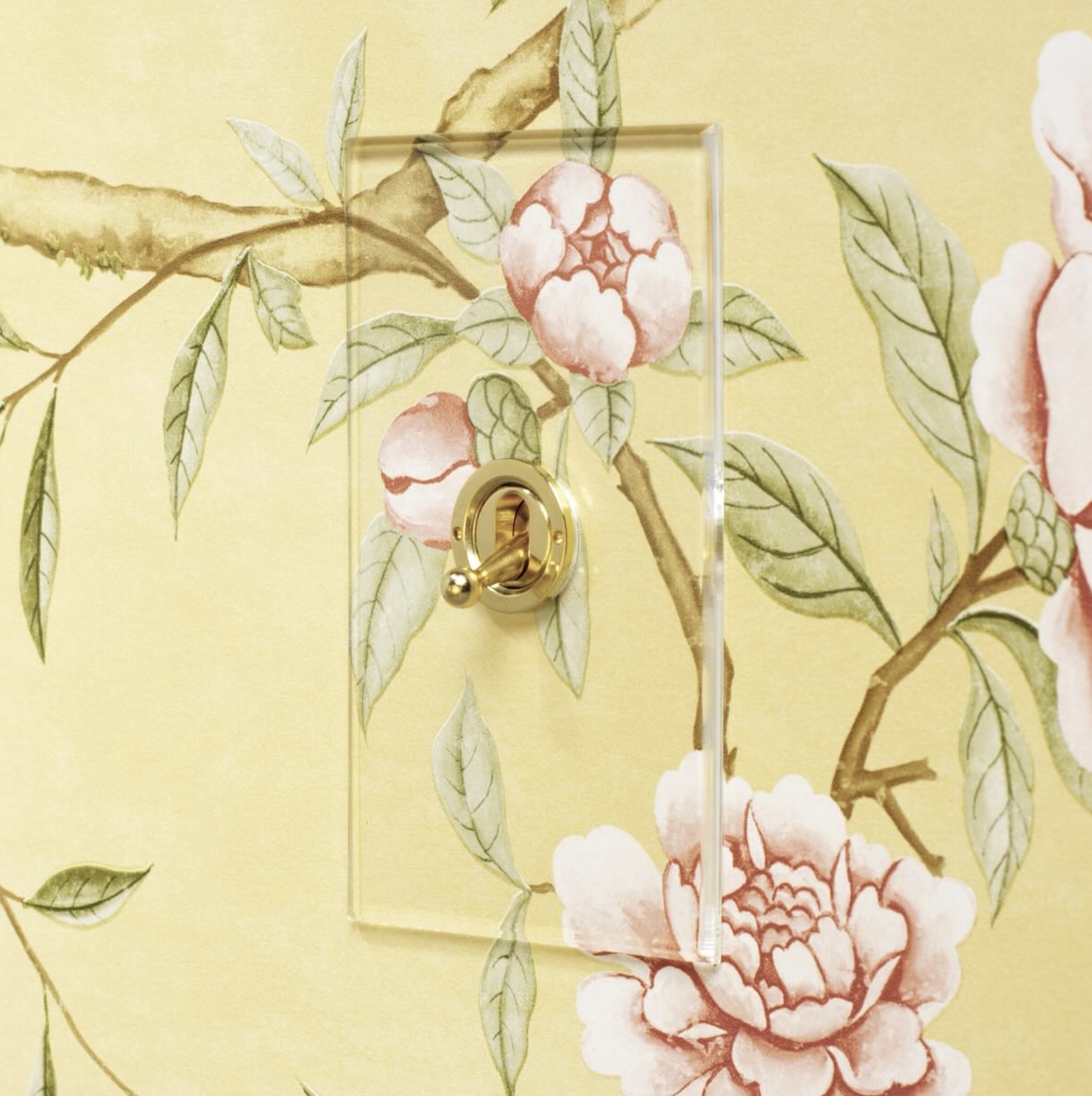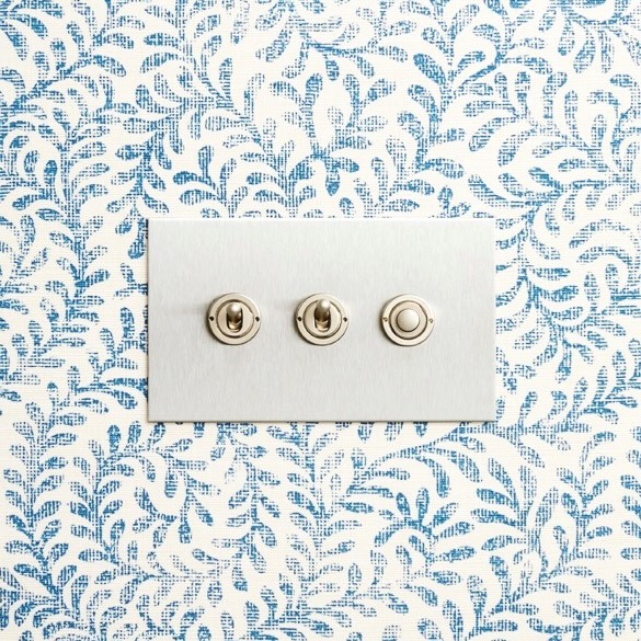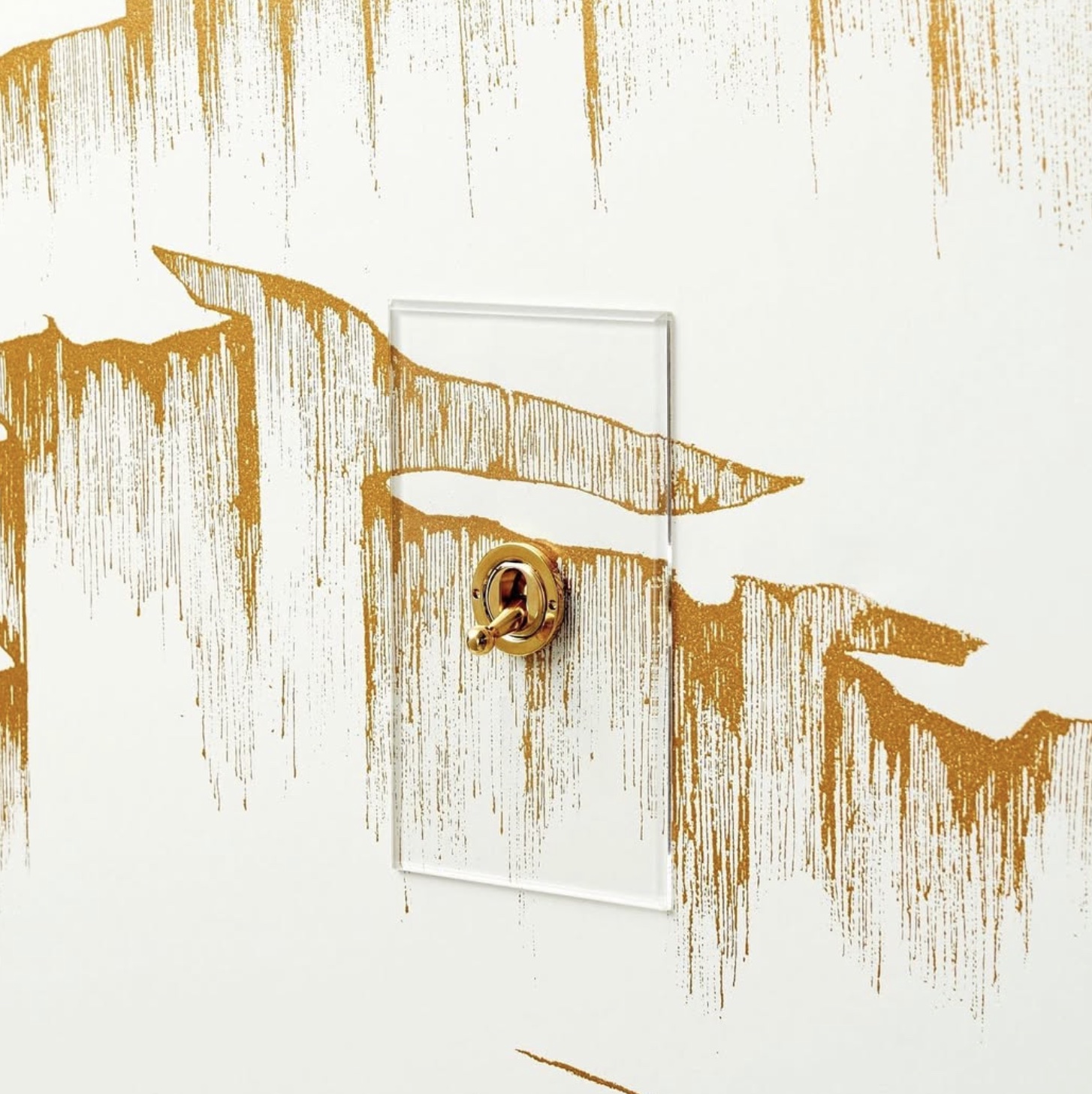The transparent acrylic plates are secured without the use of fixing screws. The plate sits flush to the wall and is supplied with Brass, Brushed Brass, Nickel Silver, Stainless Steel or Antique Bronze switches or dimmers. Each acrylic plate comes with a primed aluminium underplate which can be either painted or used as a template where wallpaper is used.