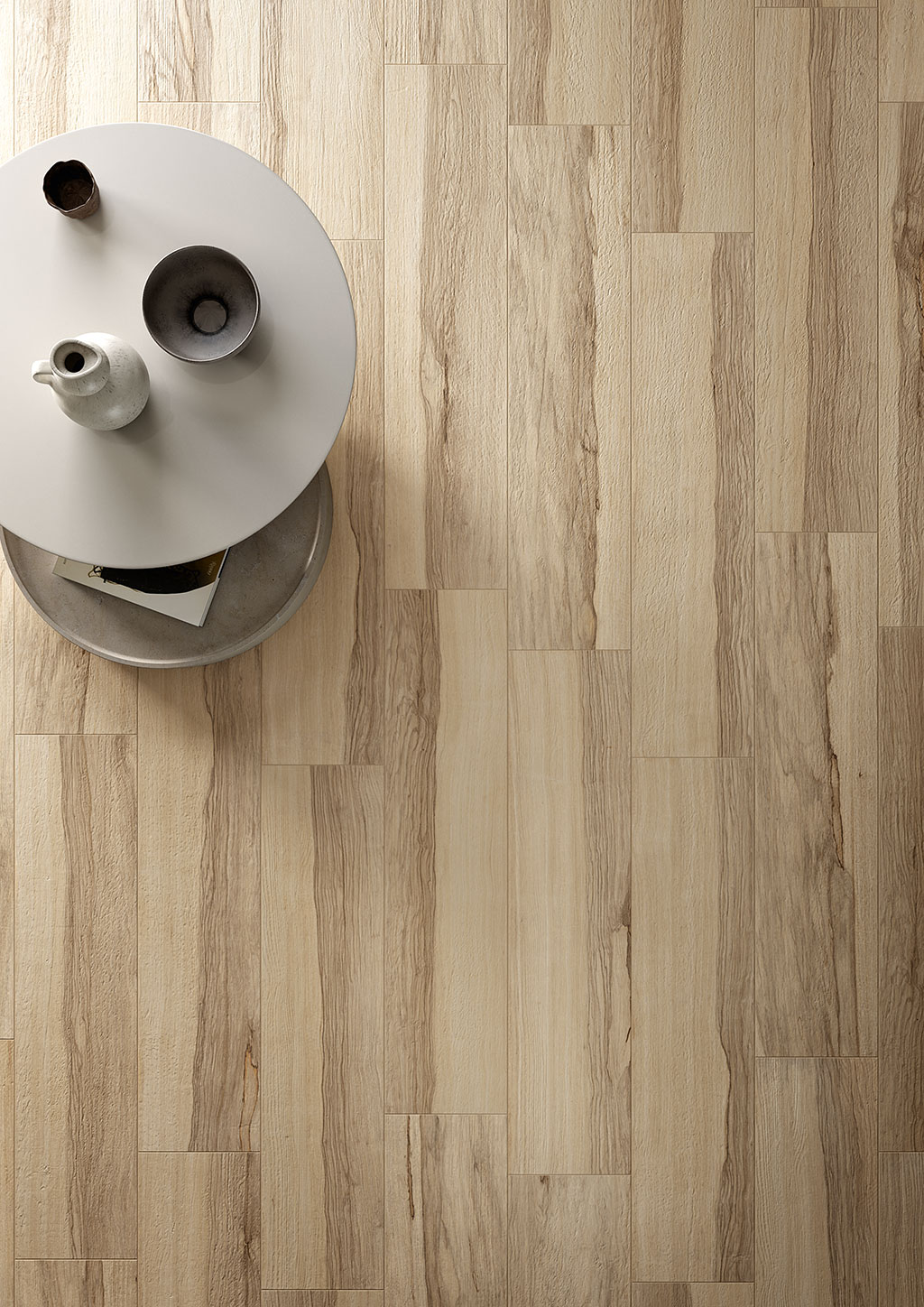 With its soft, asymmetric lines inspired by natural shapes, Fraké wood-effect porcelain stoneware is able to blend naturally with all styles, while respecting nature. Fraké is a plant that belongs to the African Broadleaf family. The wood obtained has an extremely varied, decorative pattern. Fraké highlights the natural contrasts to enhance the material quality of the wood: the precise detail and sophisticated nuances make this collection a contemporary furnishing element that brings a touch of timeless style to the home.