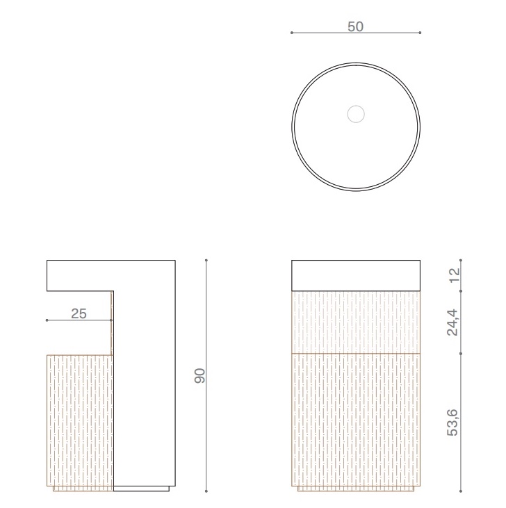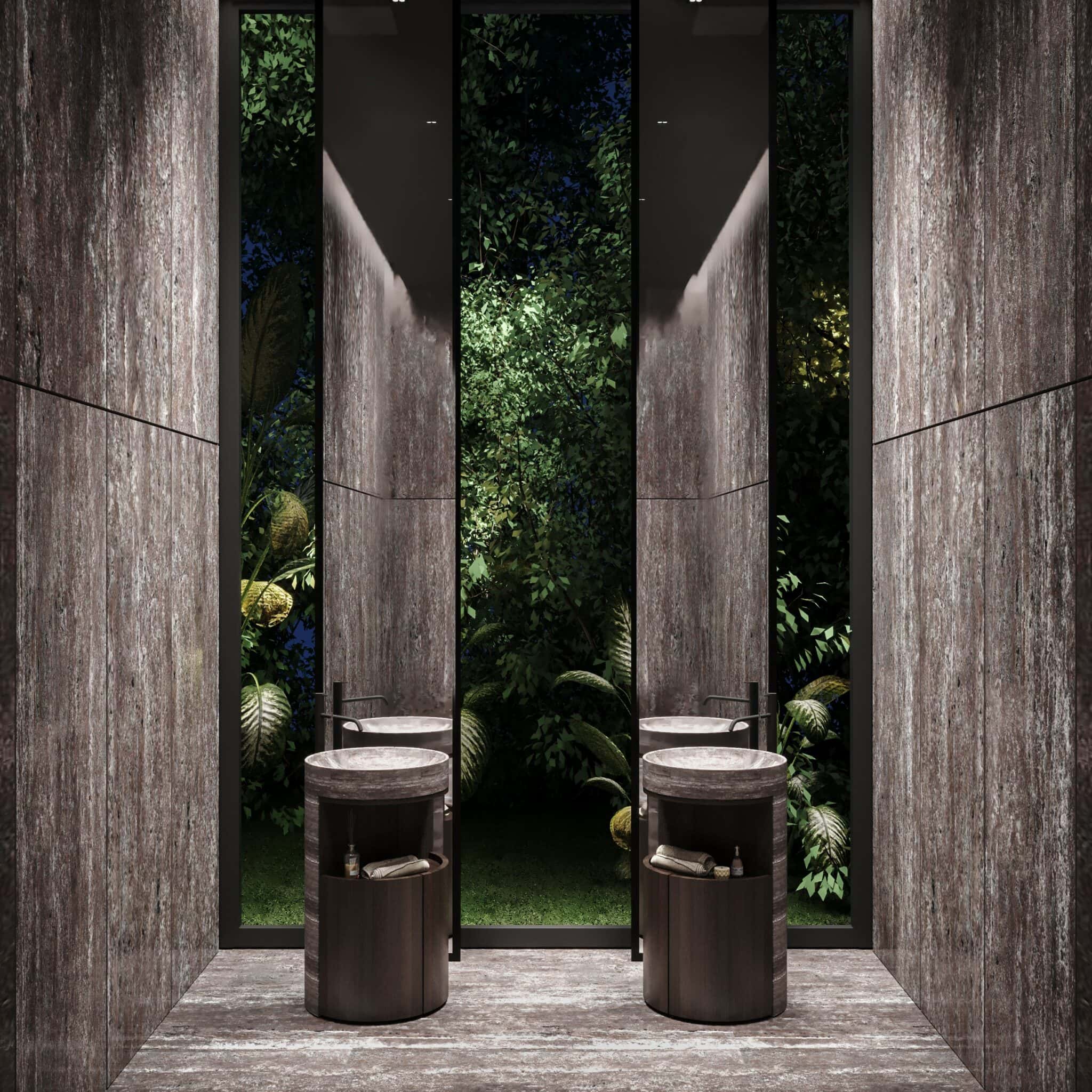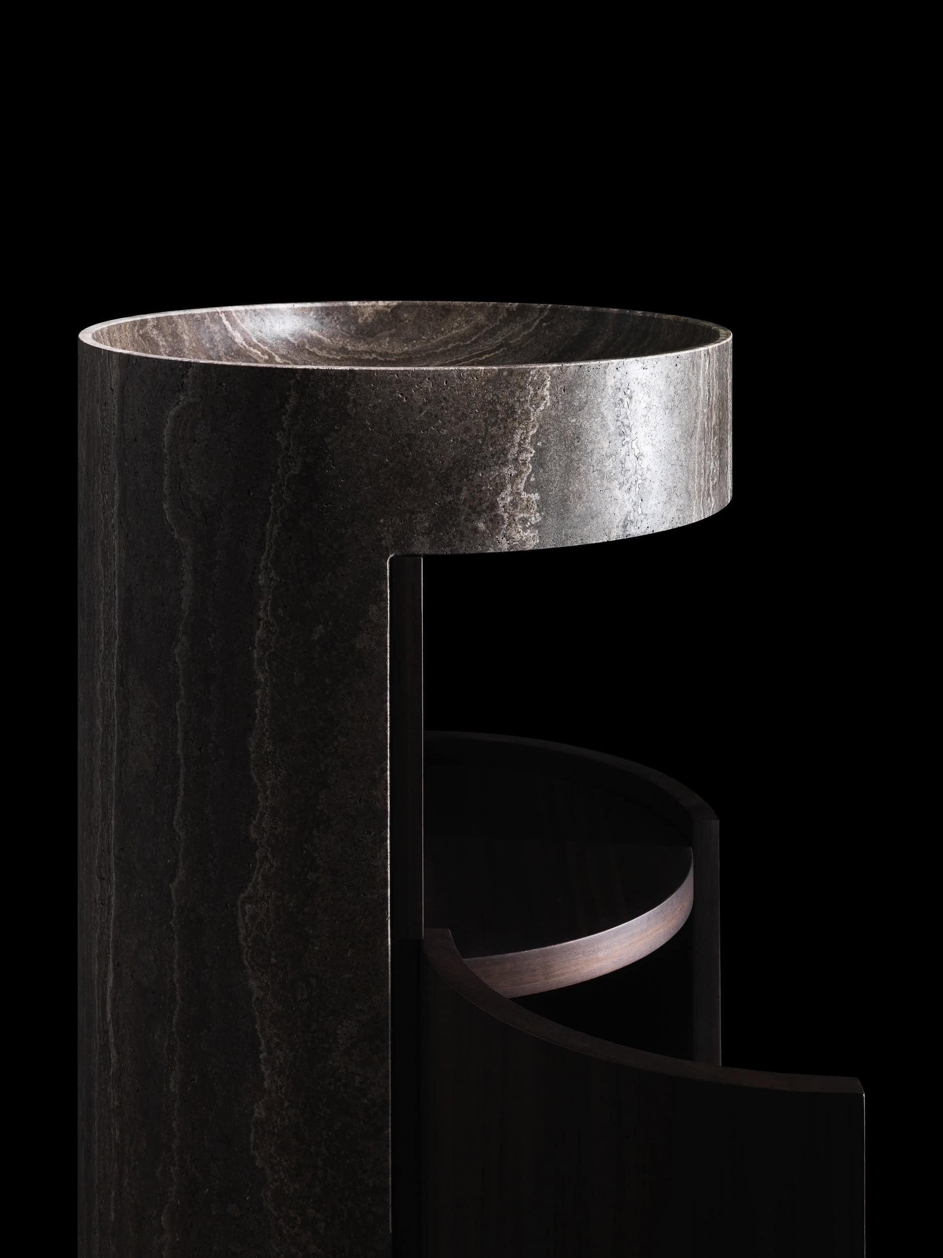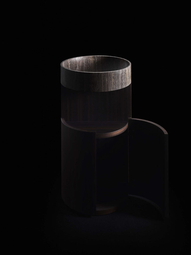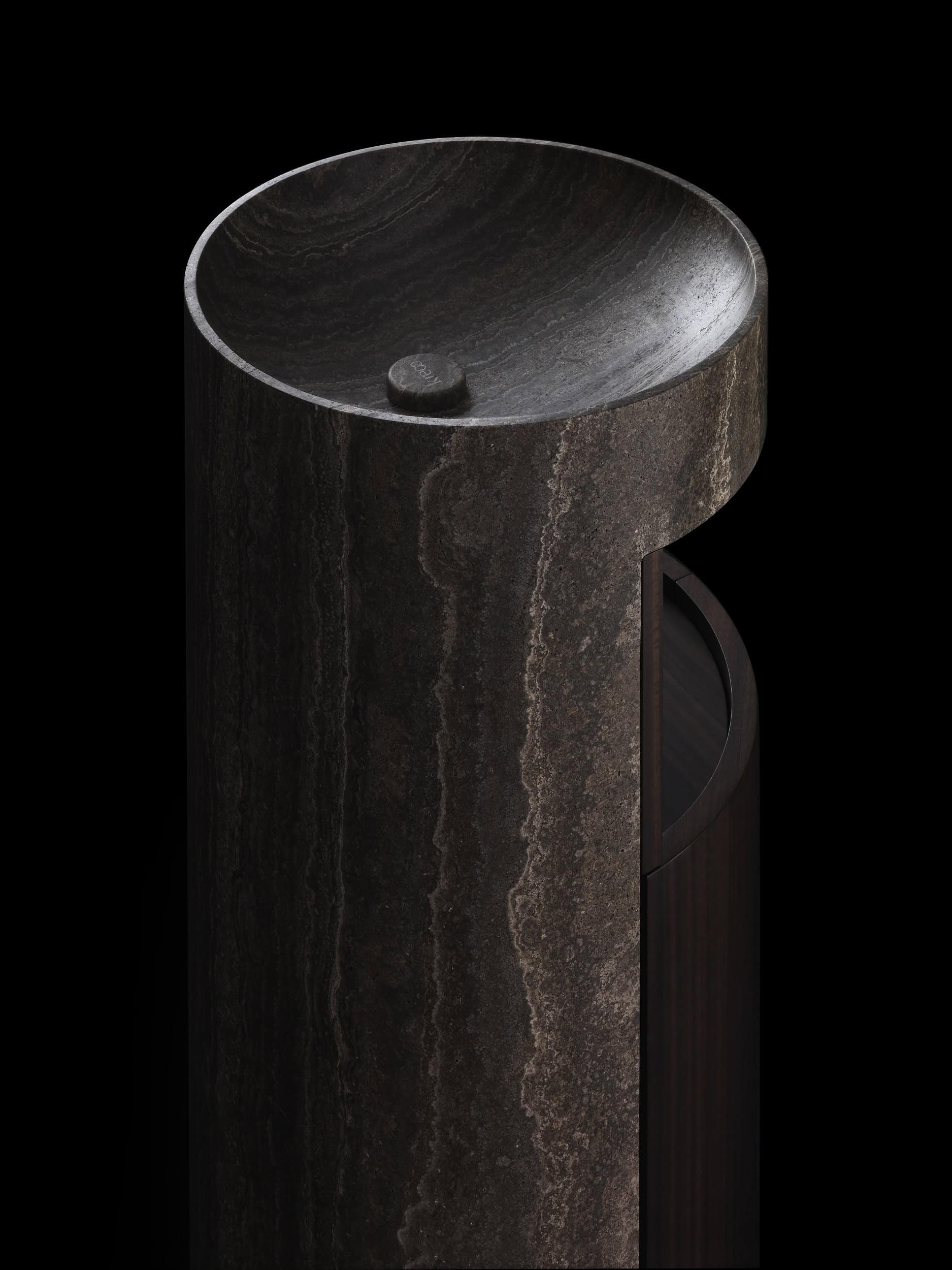 The elegant interaction between solids and voids and the combination of two materials are the main features of the Hug collection, designed by Matteo Nunziati. Part of this family, the freestanding washbasin that takes its name is conceived as an elegant marble shell – available in eight different types – that integrates, on the front, open or closed functional compartments made of walnut or eucalyptus wood that can be used to store objects, accessories and towels. The upper basin, also made of marble, has a depth of only 10 cm and frames the product, which is cylindrical in shape and available in one size only.