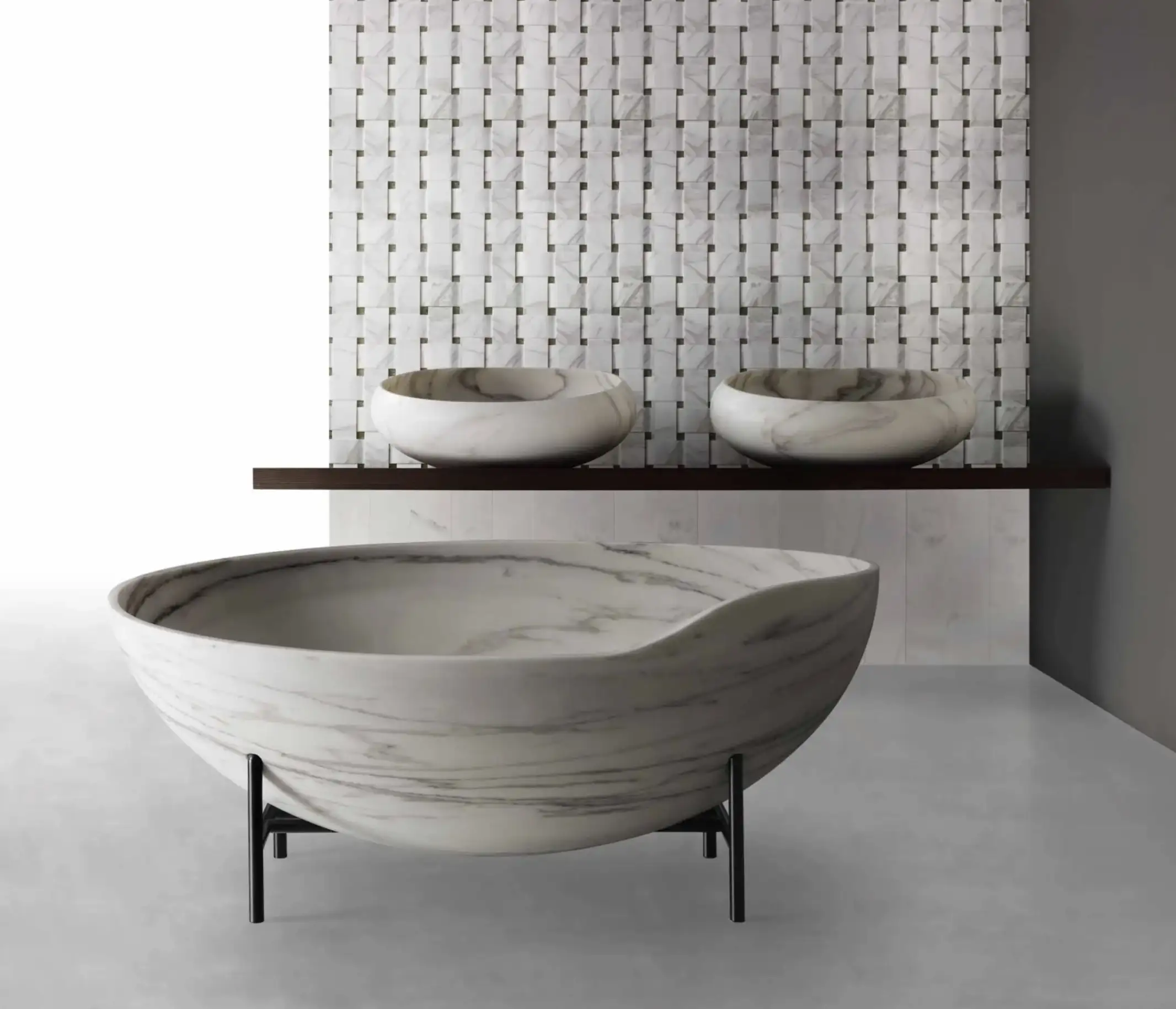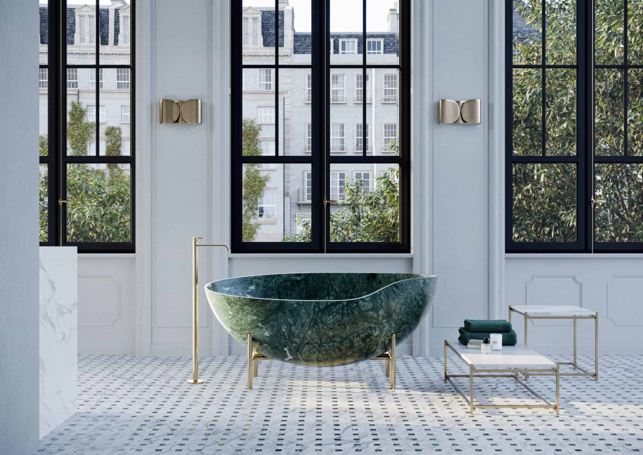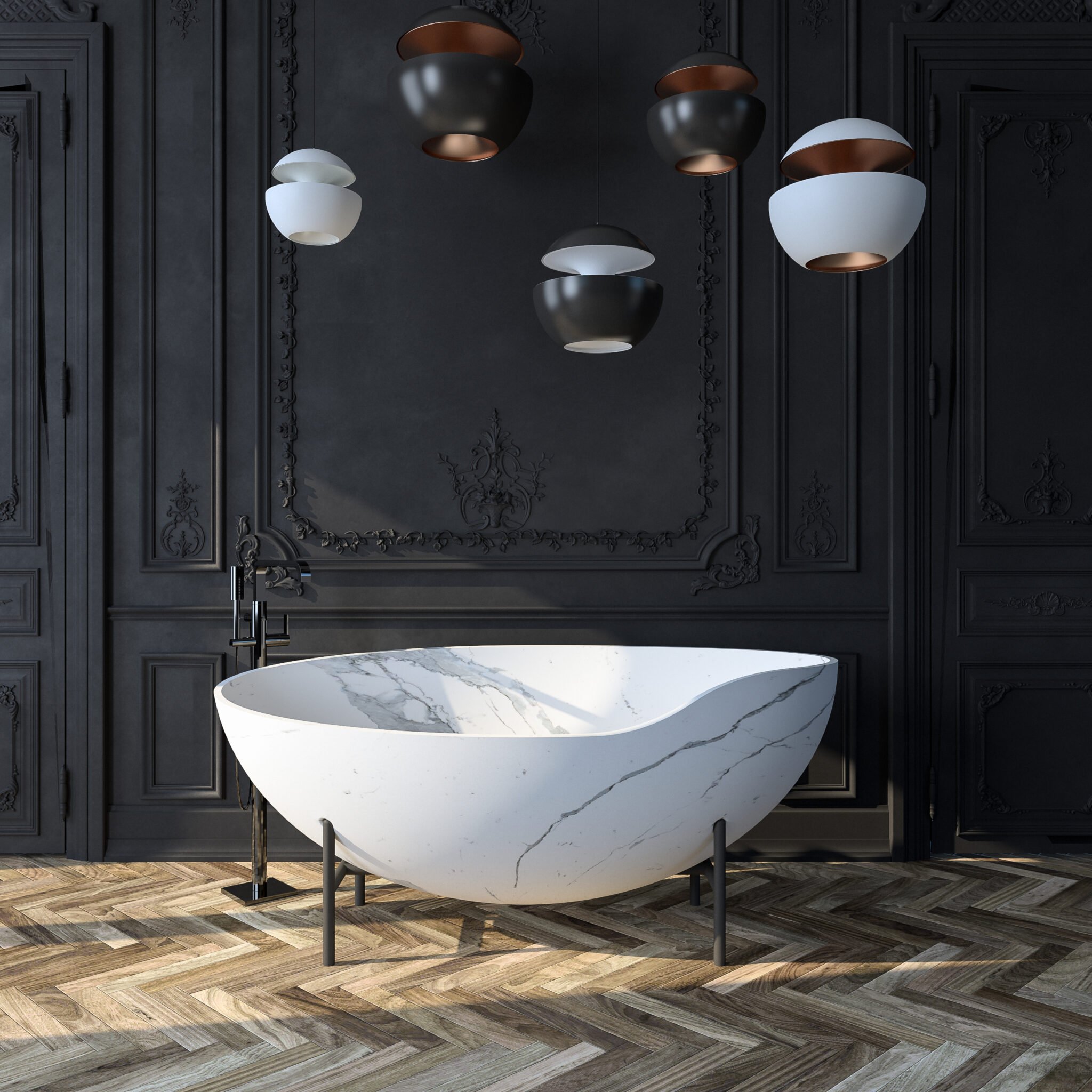 KORA freestanding bathtub, available in seven marble & three different base finisches.