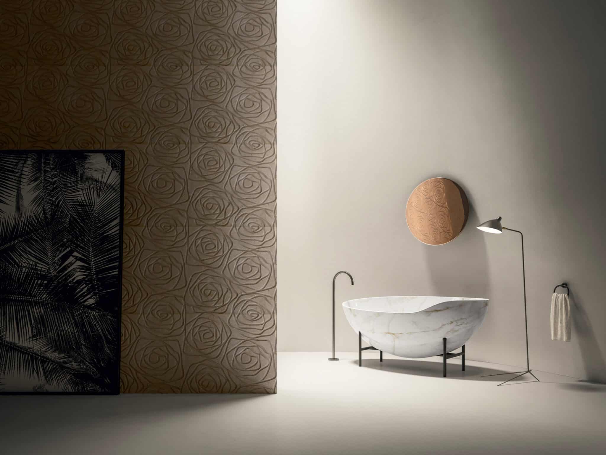 Kora marks a harmonious encounter between fluid profiles and geometries, between heavy and light, between marble and metal: the freestanding bathtub designed by Enzo Berti is carved from a single block, with an upper profile at variable heights that facilitates the entrance and gives a very stylish result. The purity of the shape is enhanced by this detail while a metal support, with gold or dark bronze finish, becomes the base and supports the monolith with an extraordinary effect.
