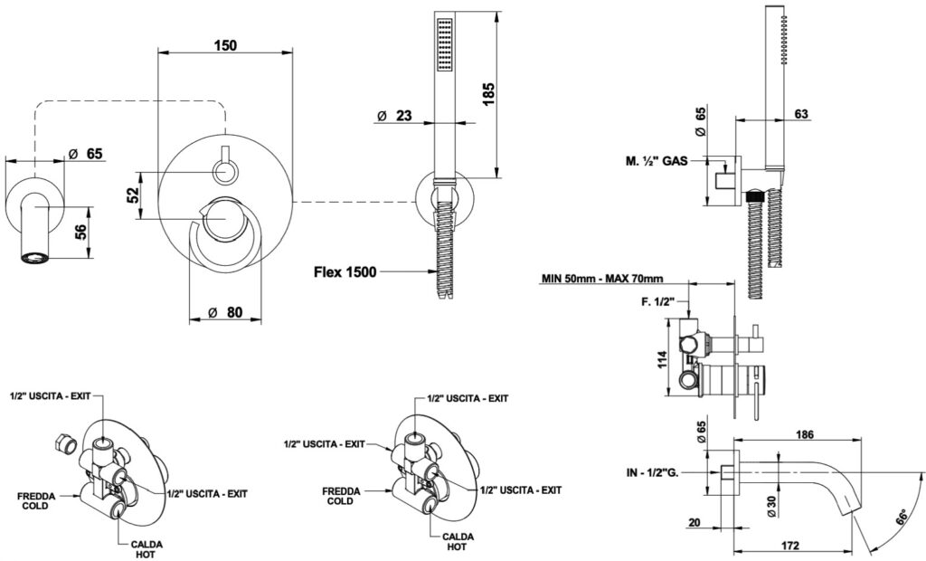 Built-in bath and shower mixer with duplex shower set and mechanical diverter.