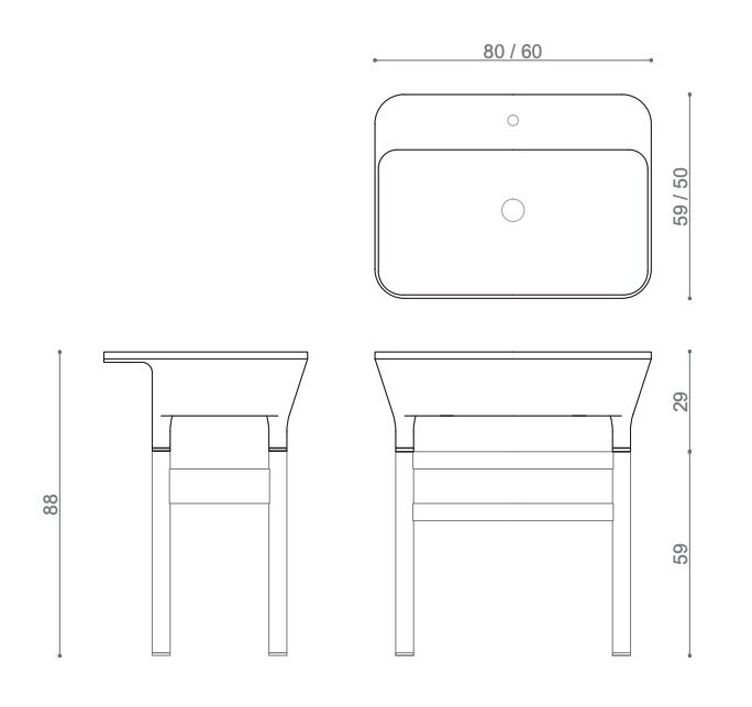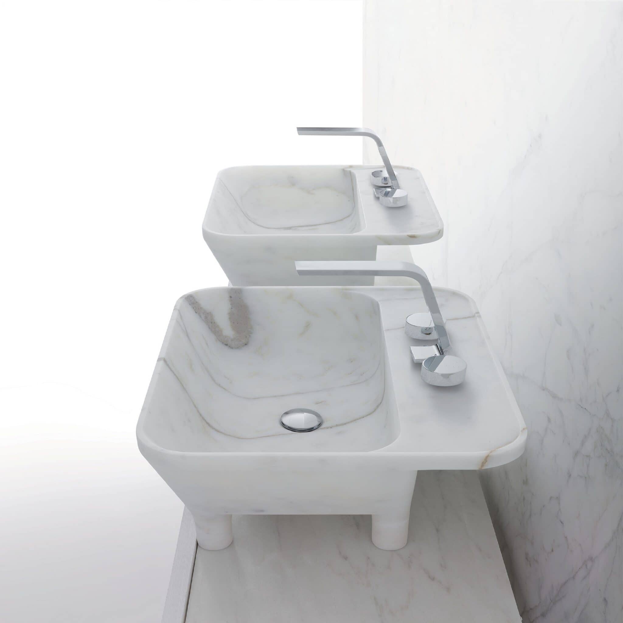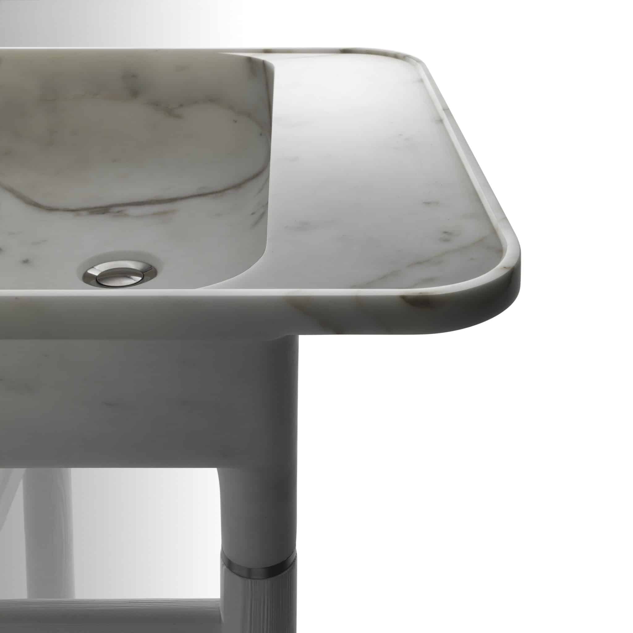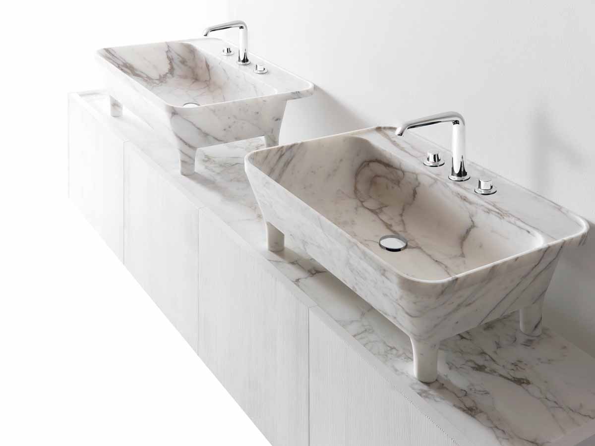 The classic archetype of the washbasin rises to a new dimension, refined and accurate in every detail, with the Loto family, designed by Enzo Berti. This collection evolves the historical memory with a product that reinterprets its proportions and thicknesses to create a contemporary bathroom object, the result not only an evolution in image but also of a combination of marble, wood and delicate metal inserts. The large basin, in marble and customizable in seven different types of stone, has essential lines and extends with four little stands to connect to the base, a wooden trestle with circular legs and rectangular crosspieces available in different lacquered options. Loto can also be a counter-top basin and is available in four different sizes. As additional option, it can be combined with a shelf that further emphasizes the inspirational theme of the project