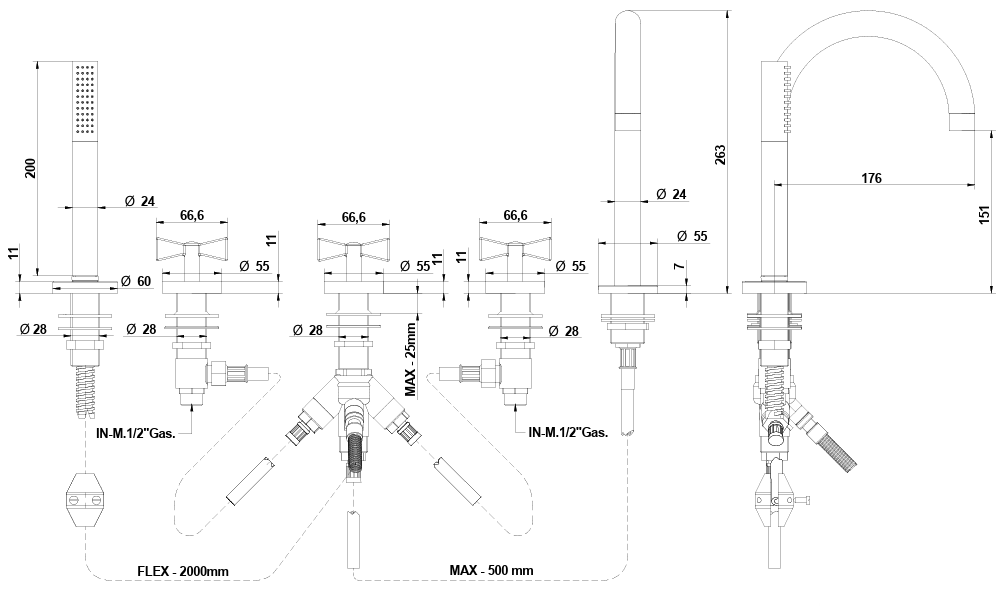 Five holes deck bath and shower mixer with shower set.