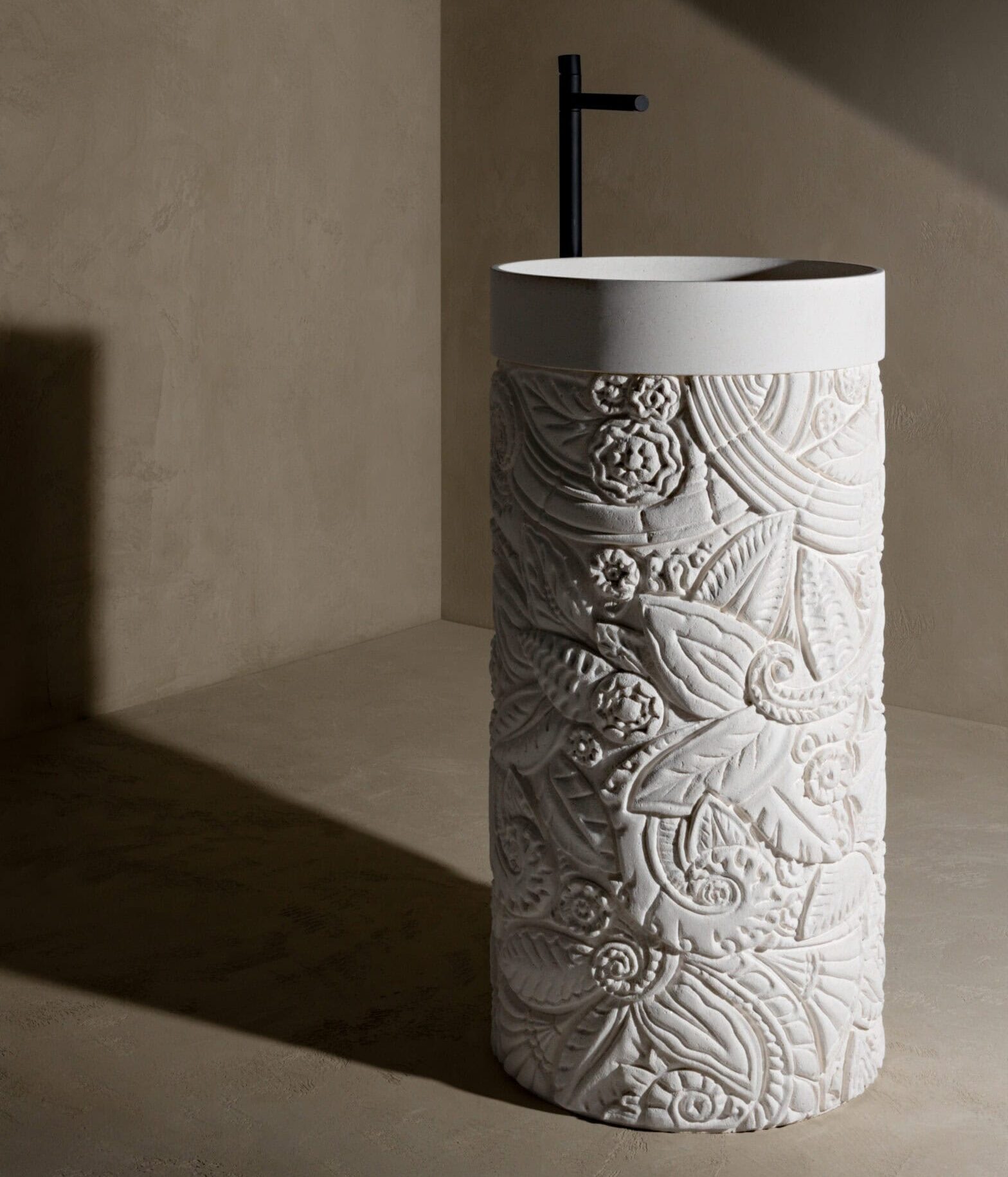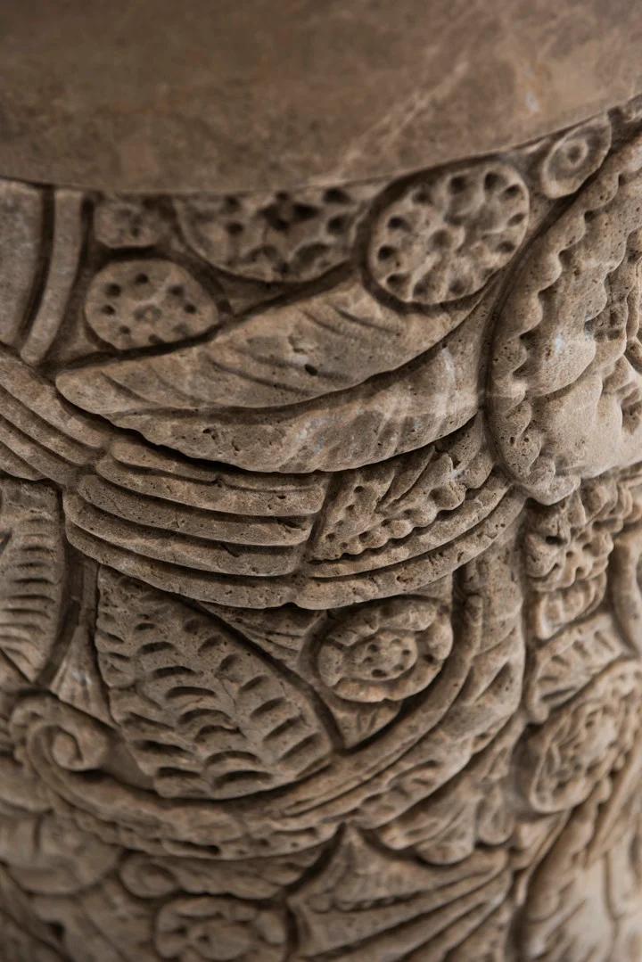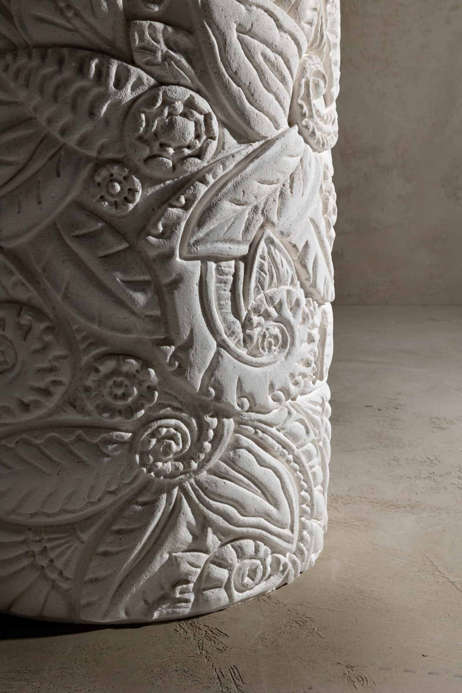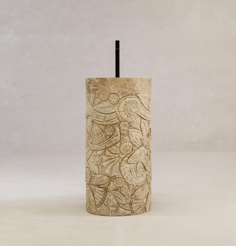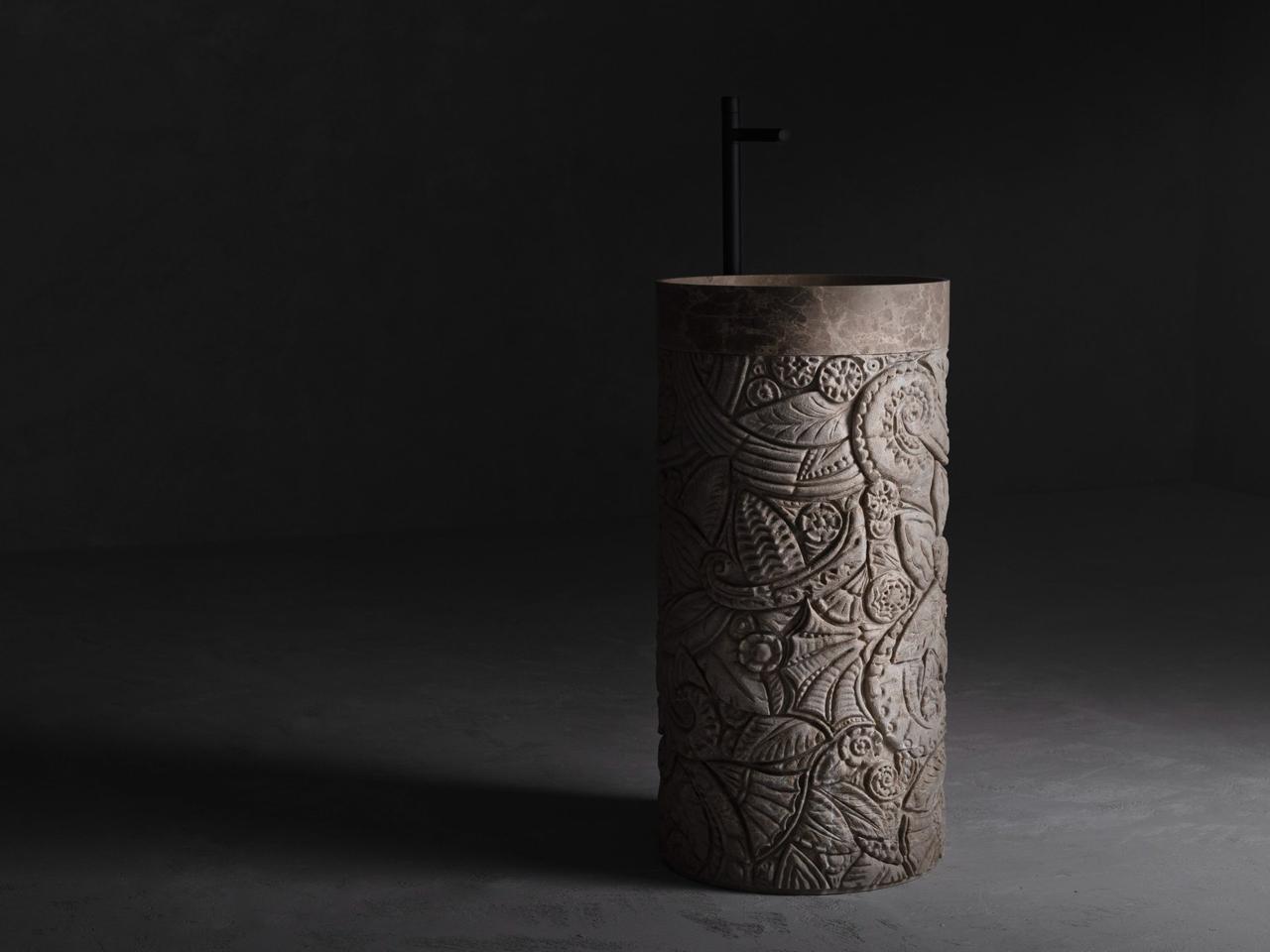 A cylinder carved from a single block of marble offers a continuous surface to be shaped with intricate patterns, sometimes delicate, sometimes broader, at different depths. This is mercy, Kreoo’s sculptural freestanding sink that celebrates the vocation of natural stone, a living material in which to carve stories and languages to be passed down, precious and eternal. Here, leaves, curls, elegant fan-shaped forms, and themes inspired by vegetation follow one another in the decorative development curated by Christophe Pillet, who imagines a unique interweaving of shapes, echoing classical culture at times and the memory of distant territories at others. The result is an evolving work of art, the product of complex processing between technology and craftsmanship. The chiseled portion is topped with a matte-finished ring, which continues inside with a concave and soft shape, while a flush drain is carved into the marble. Emperador Light, Olive Grey, Bianco Carrara, and Bianco del Re are the four material options available to customize the collection, envisioned to become the centerpiece of a bathroom environment in high-end residential or hospitality projects.