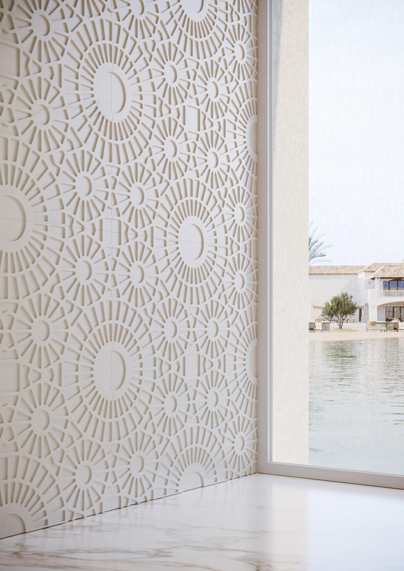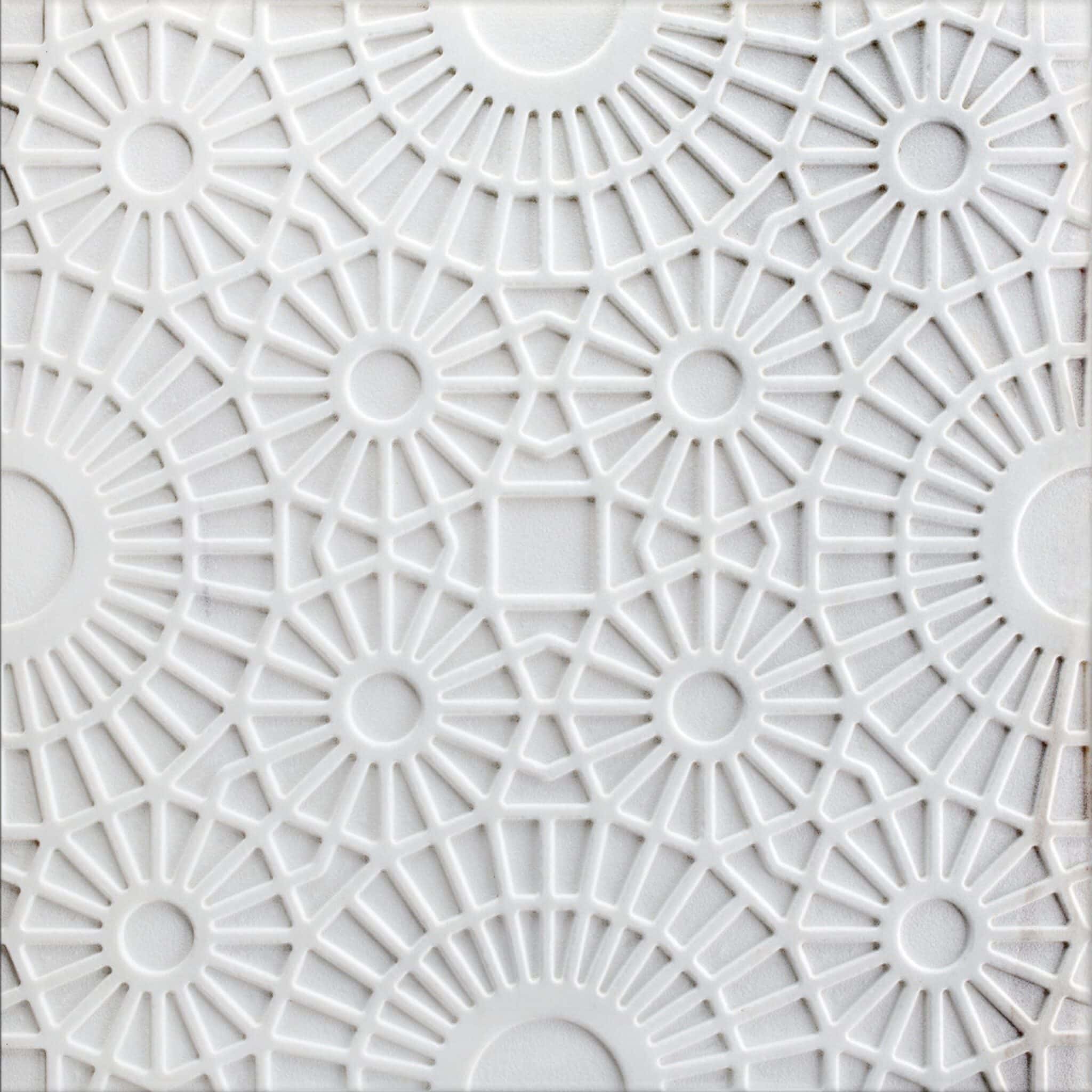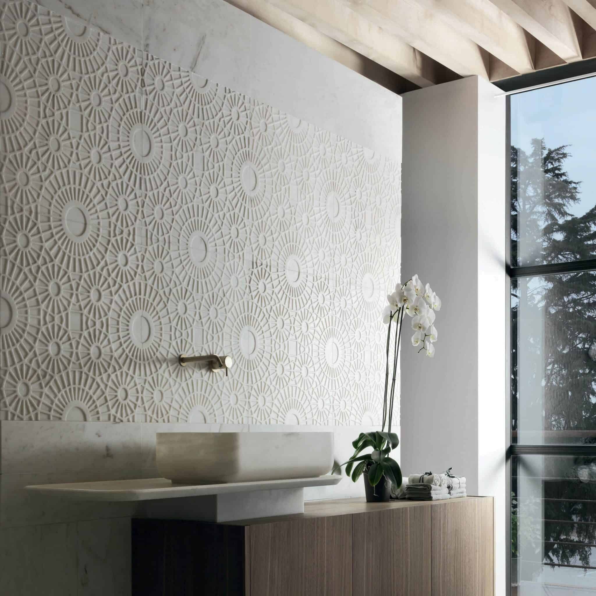 The traditional ornamental motif of Venetian lace, with its textured designs, inspires the precious collection of marble coverings that takes its name, reinterpreting it in a contemporary language. The braids are imprinted in the material and follow one another in a continuous pattern, alternating circular elements characterized by different sizes and details, to draw walls similar to handmade lace. The decorations are embossed and give life to a three-dimensional surface, proposed in four different types of marble and modular.