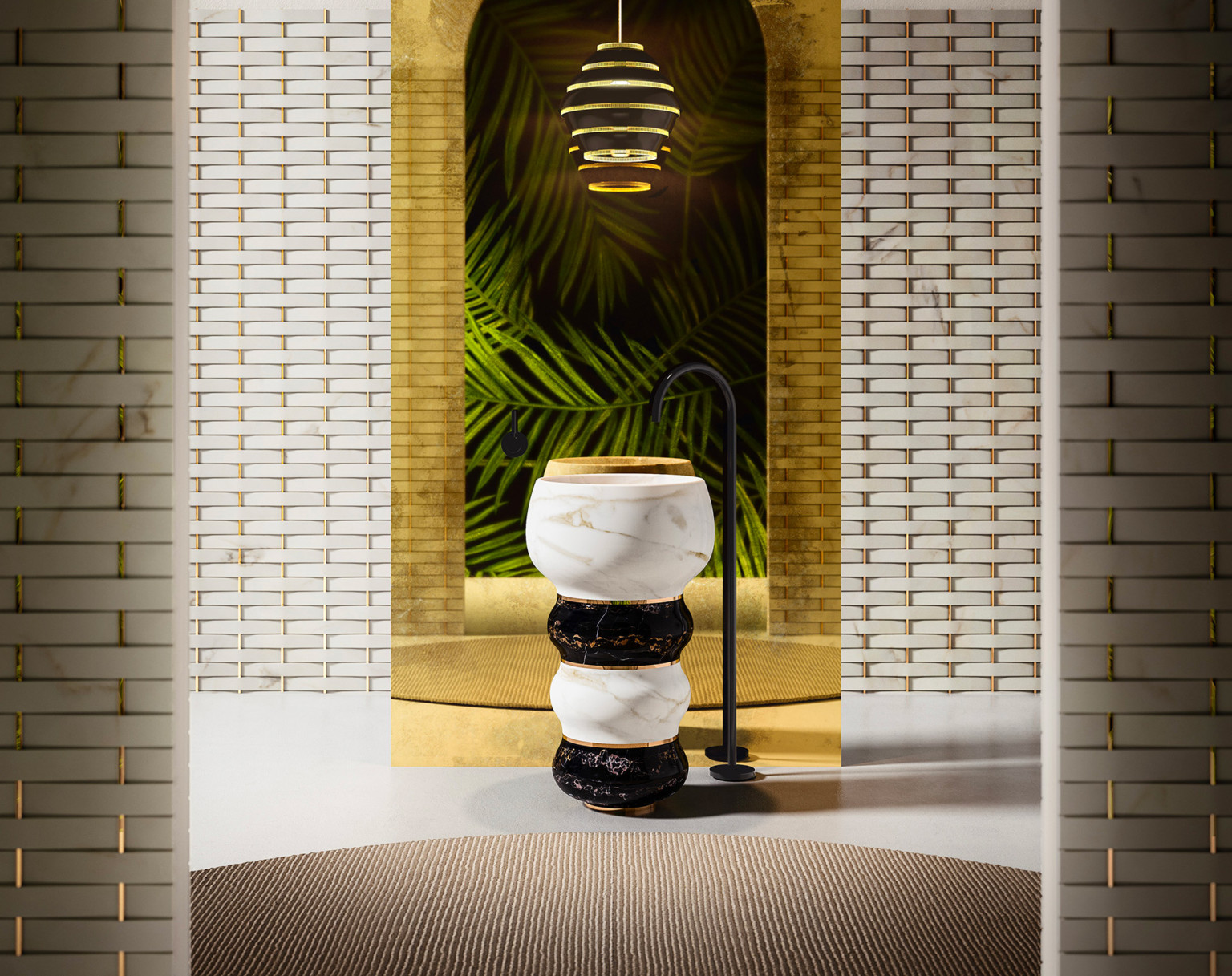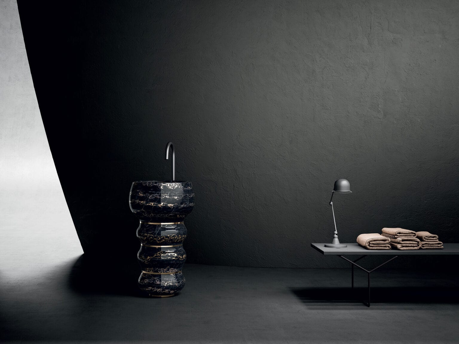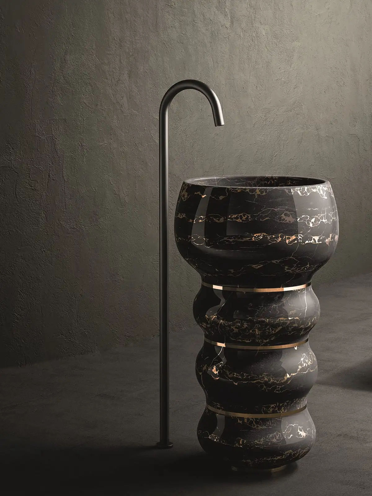 The washbasin becomes a sculpture with Bubbles, the freestanding bathroom collection designed by Marco Piva that is constructed as a sequence of soft, concave and convex shapes, perfectly balanced with each other. Three rounded rings, with a circular section, form the important base, completed by a final element, of the largest size, which acts as a basin: thin metal strips in a golden brass finish are inserted to divide them, becoming a decorative and functional element and allowing you to work on small blocks of natural stone to reduce waste.