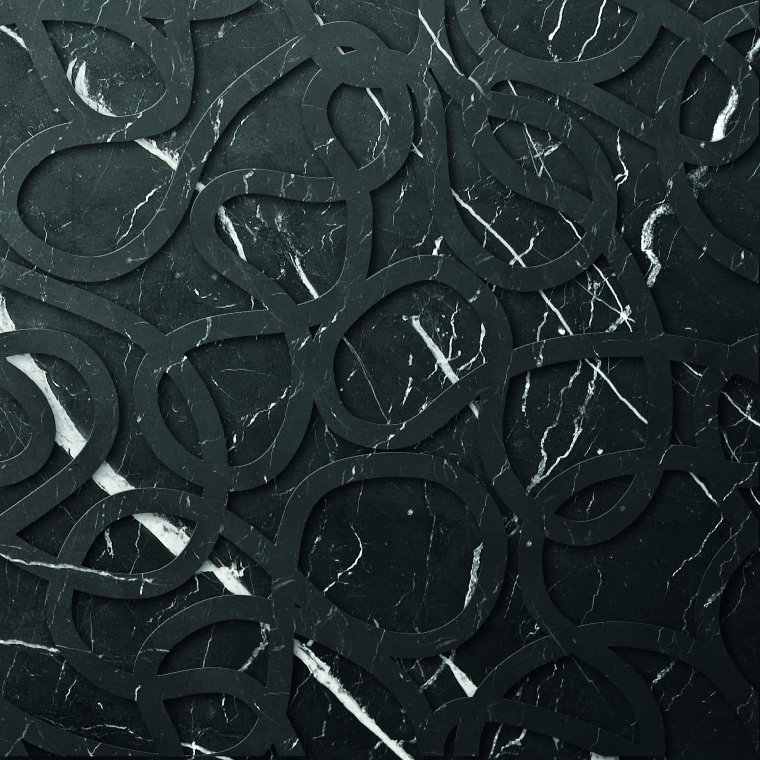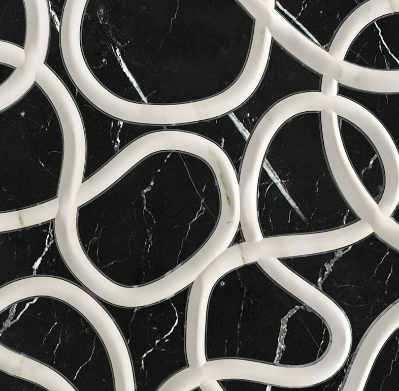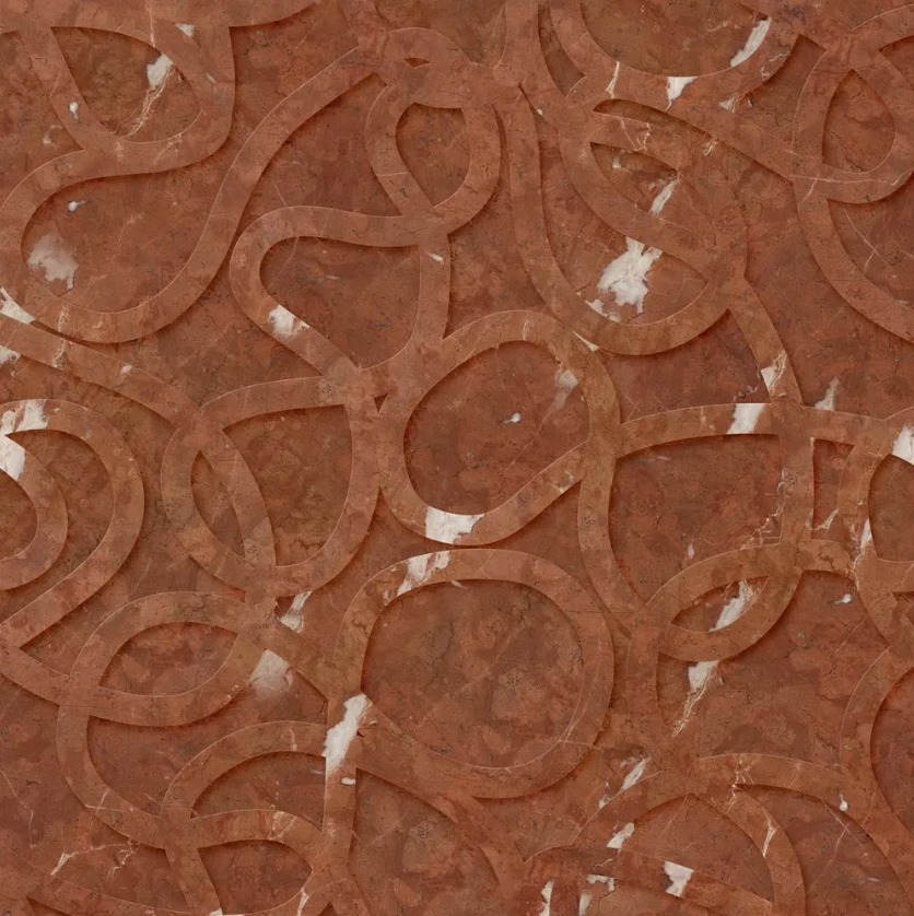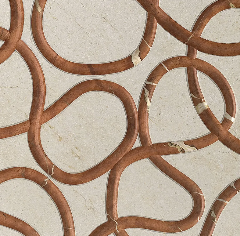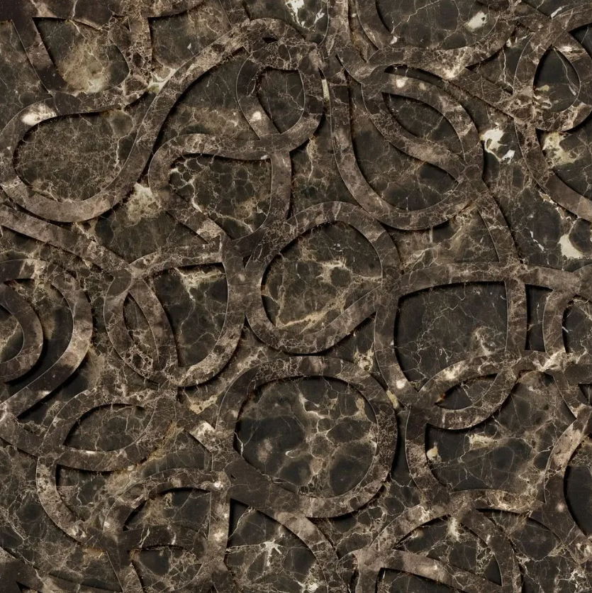 A patented Kreoo technique that joins two contrasting marbles to create dimensional surface effects. One marble is layered over another, then intricately carved with a pre-selected design. As the top layer is cut away, the lower marble is revealed beneath—forming bold, textural patterns.