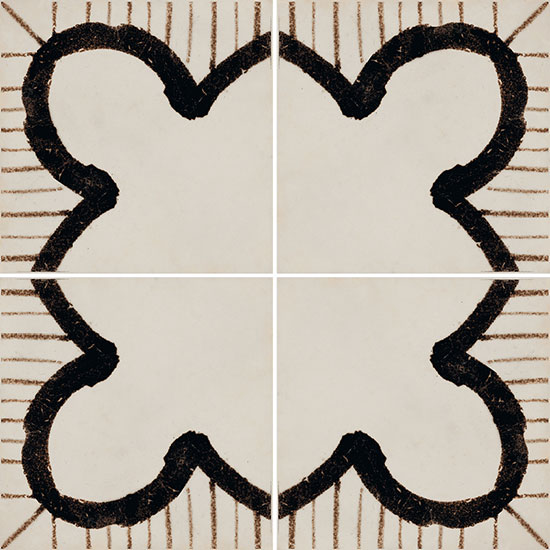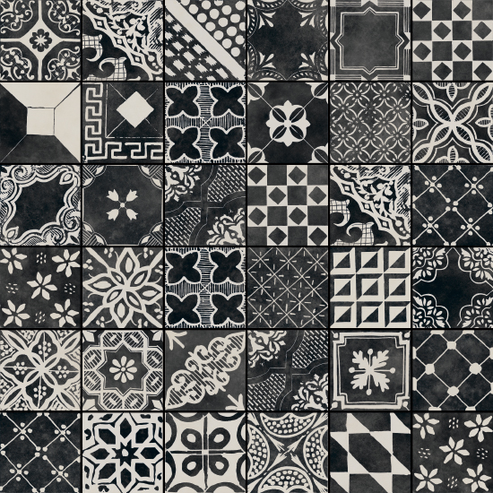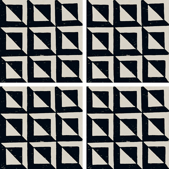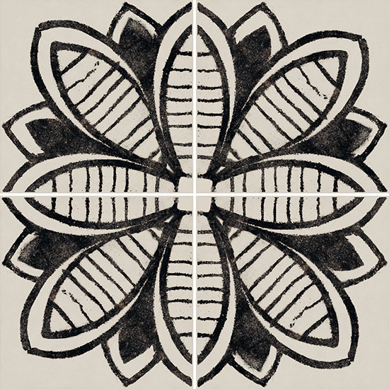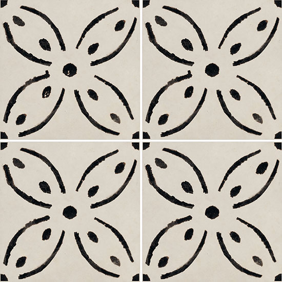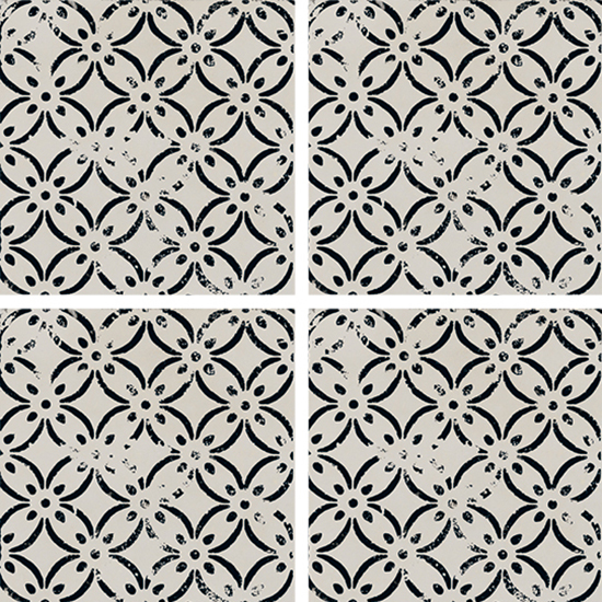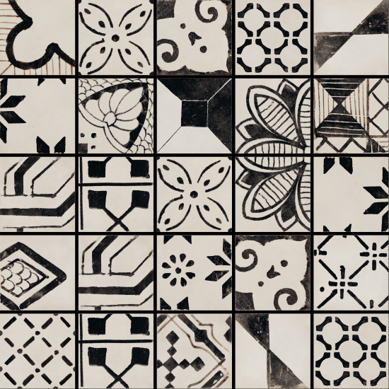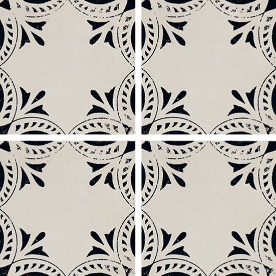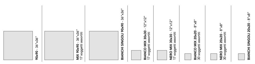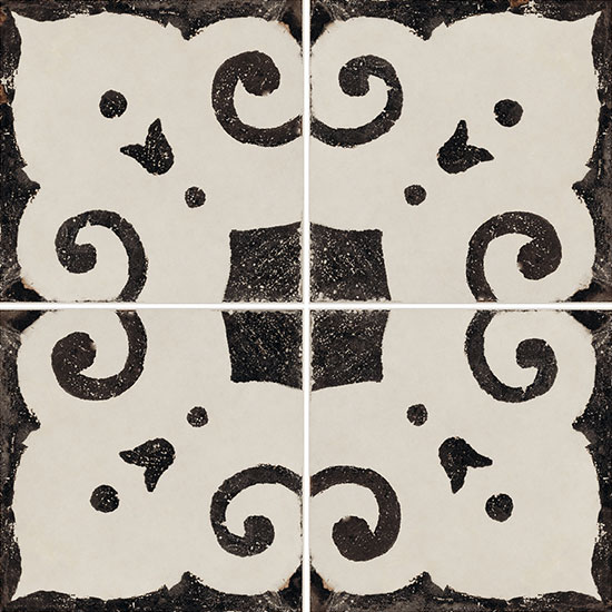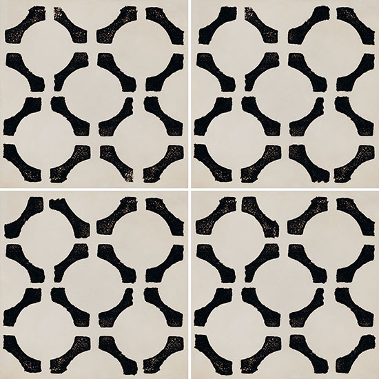 A collection with a sophisticated graphic impact in contrasting black and white, with a distinctive, slightly worn effect that creates a traditional allure. Riggiole comes in three sizes. The signature feature of the collection is the 90×90 size, followed by the more traditional 30×30 and 20×20 options. The decoration has a strikingly hand-crafted look, reminiscent of the skills of the ceramists of centuries ago, establishing a link between past and present. This rich variety of options allows for the design of original patchwork-style porcelain stoneware floors, as well as regular, repetitive laying patterns.