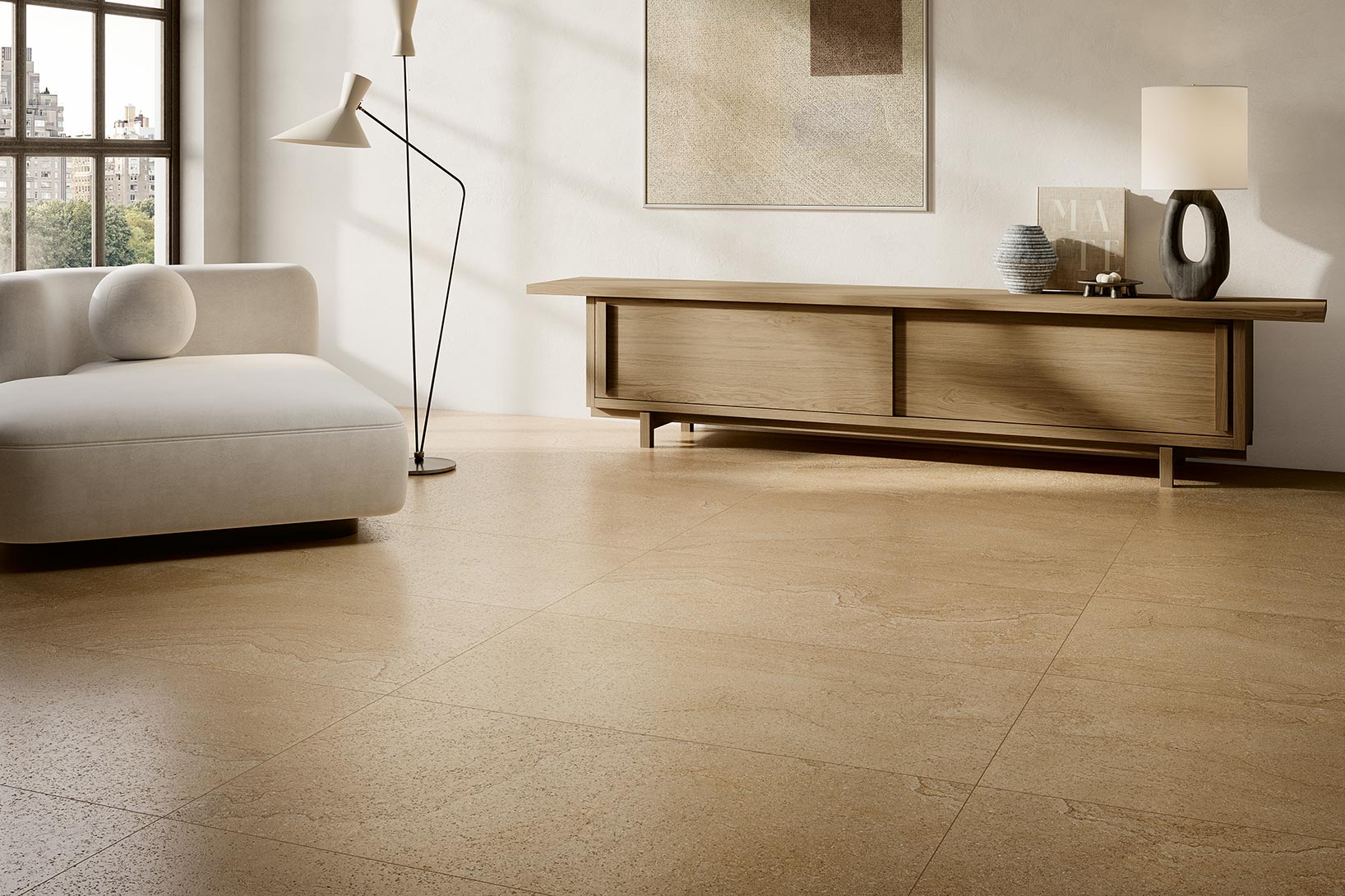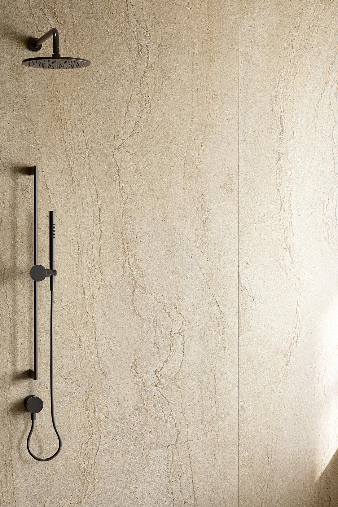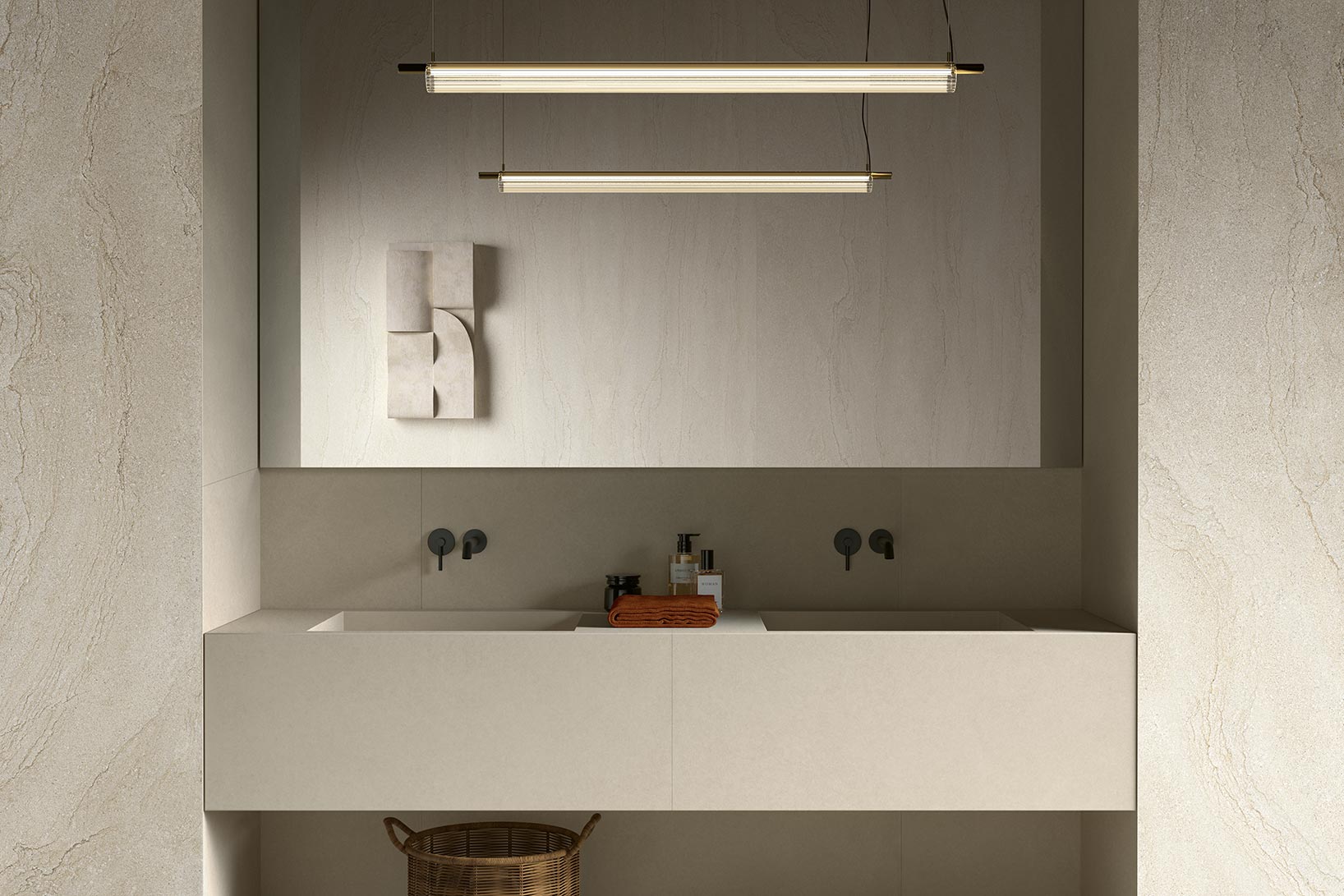 Sinai is a stone-effect porcelain tile collection inspired by the timeless beauty of Golden Sinai stone from Egypt. Its variegated pattern, featuring predominantly golden shades, with veins ranging from beige to brown, brings an enchantingly beautiful look to bathroom, kitchen and living room walls. It is also available in the outdoor porcelain tile version with an “R11 Soft&Safe” finish, with both a 9 mm and a 2 cm GresX2 thickness, for an easy-to-clean, soft-to-the-touch and safe anti-slip surface.