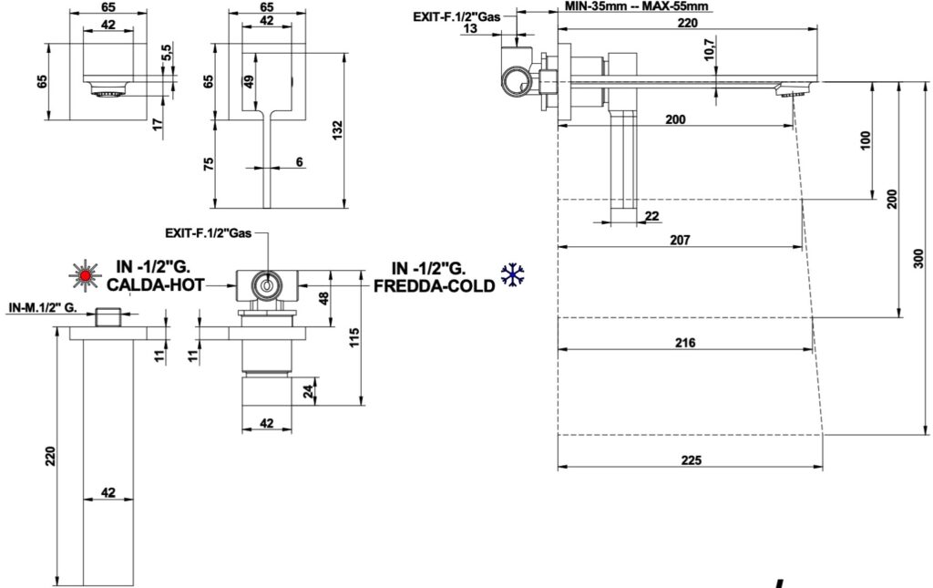 Built-in wall-mounted basin mixer with 220 mm long spout.