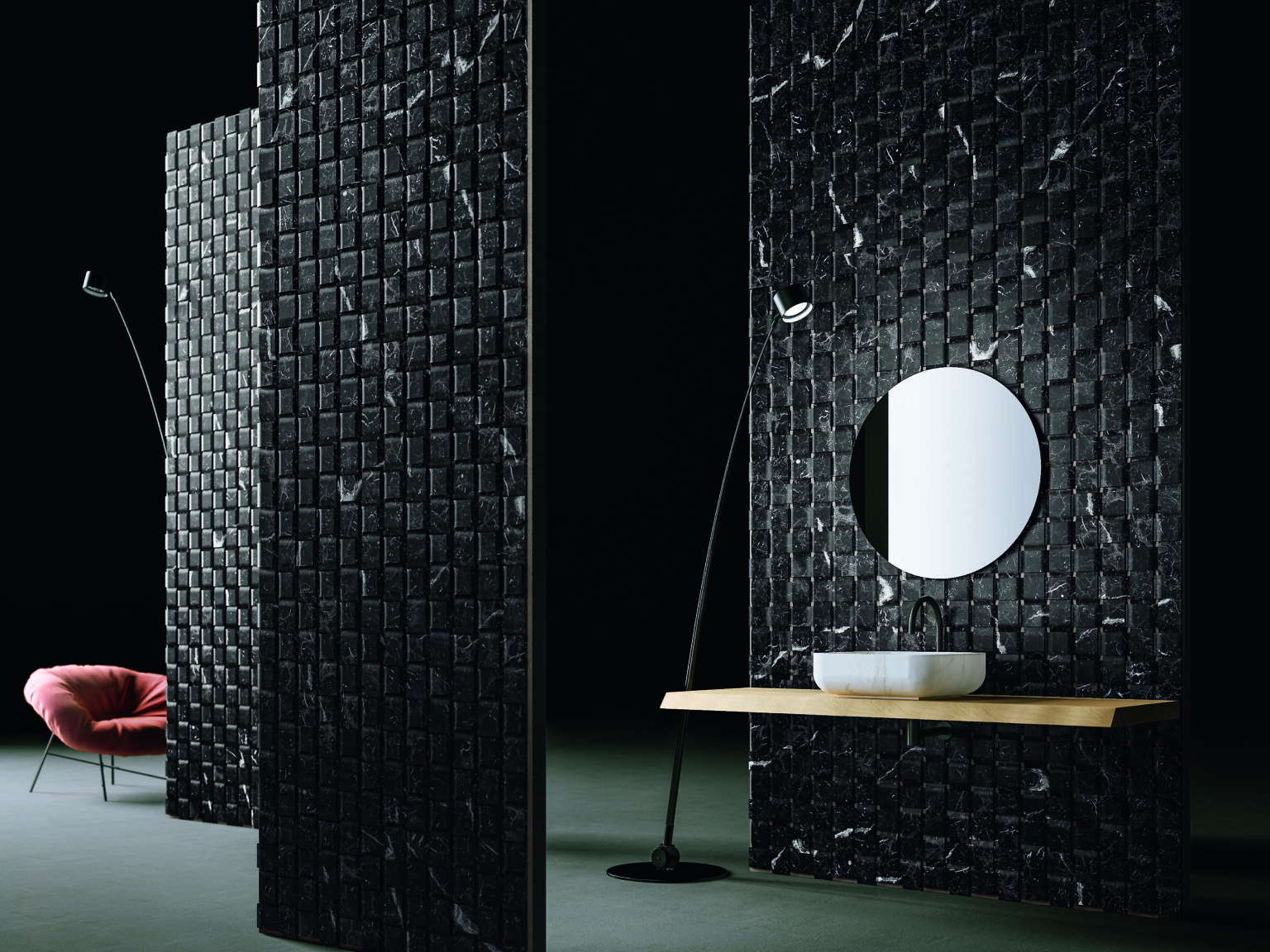 Texo resembles the idea of a braided fabric, in which elements are overlapped to create a three-dimensional texture. Through the special handcrafting process, the marble creates a pure and regular texture made of thin bands perpendicular to each other, which can be used for wall coverings in living rooms, bathrooms and public spaces. Texo is available in a single marble finish, or with a wider decorative effectin a playful intertwining of two types of marble or with a gold, pink or dark bronze effect background.