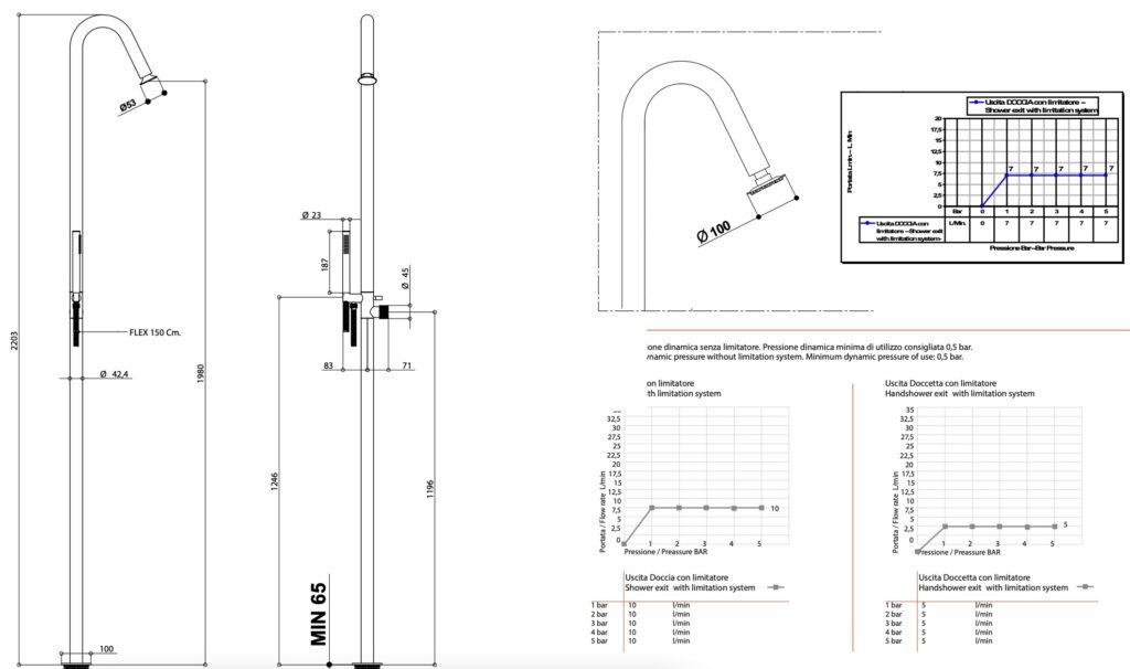 316 brushed stainless steel free standing shower column with progressive cartridge, diverter, shower set and rain or bubble shower erogation.