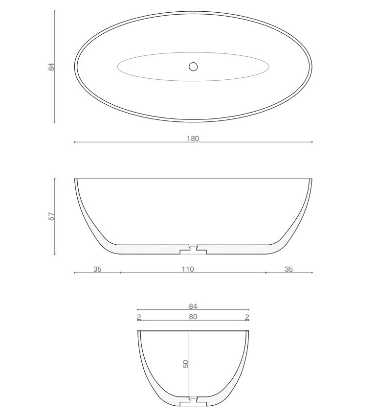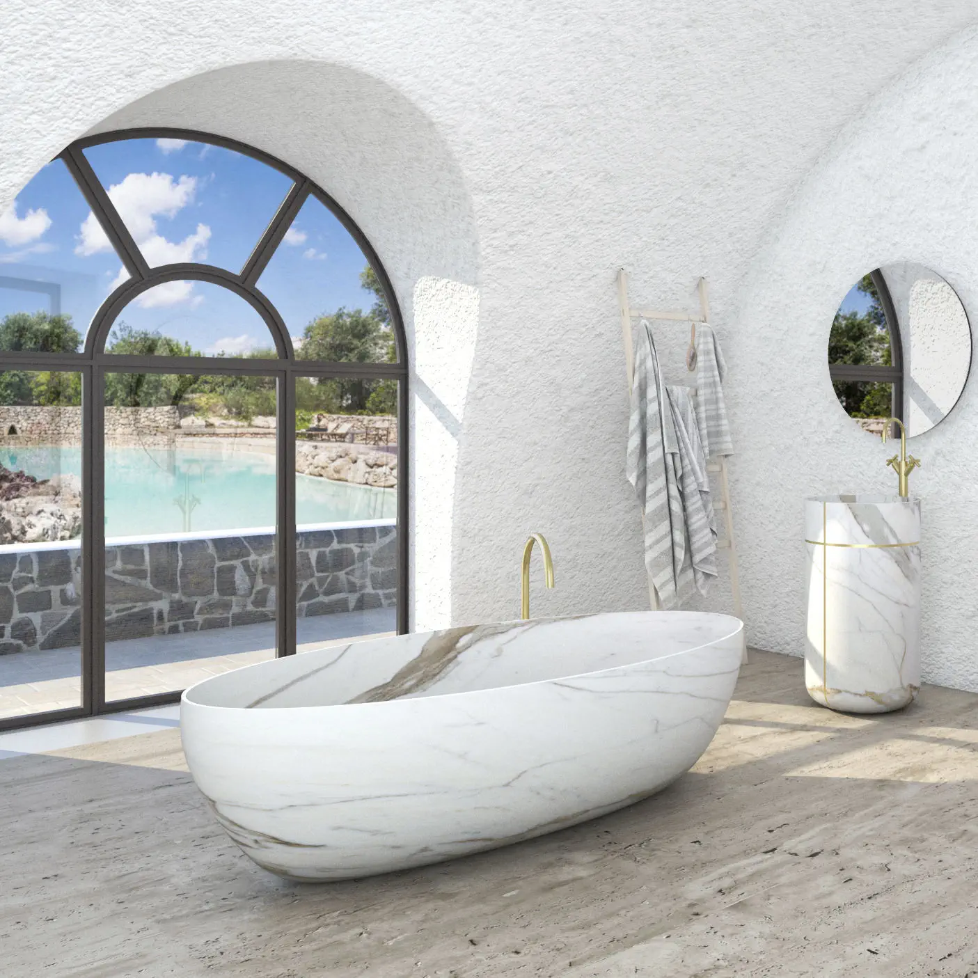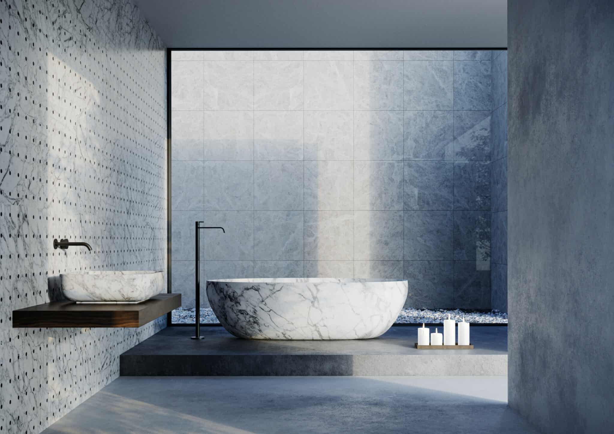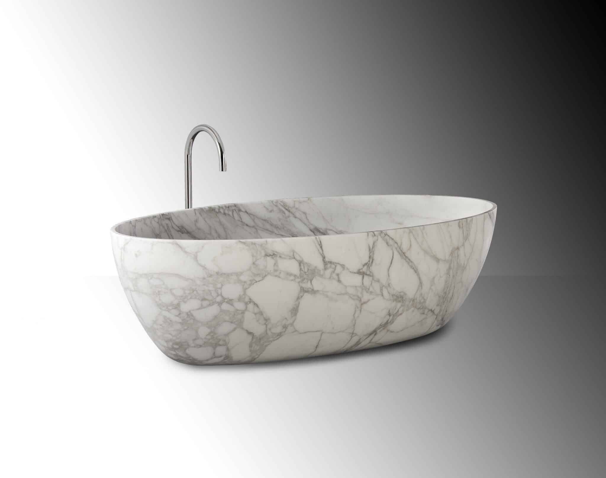 A freestanding bathtub to be positioned freely in space, Venice is carved from a single block of marble, with a particular study of proportions that makes it a product with harmonious details. Its perfect oval shape, in a single dimensional variant, is accentuated by the edges of the tub and the upper profile, whose thickness of only 2 cm gives lightness to the design and guarantees its ergonomics, enveloping the body cradled by the water. Thanks to its essential lines, Venice enhances the natural decorative texture of the marble, proposed in seven different types.